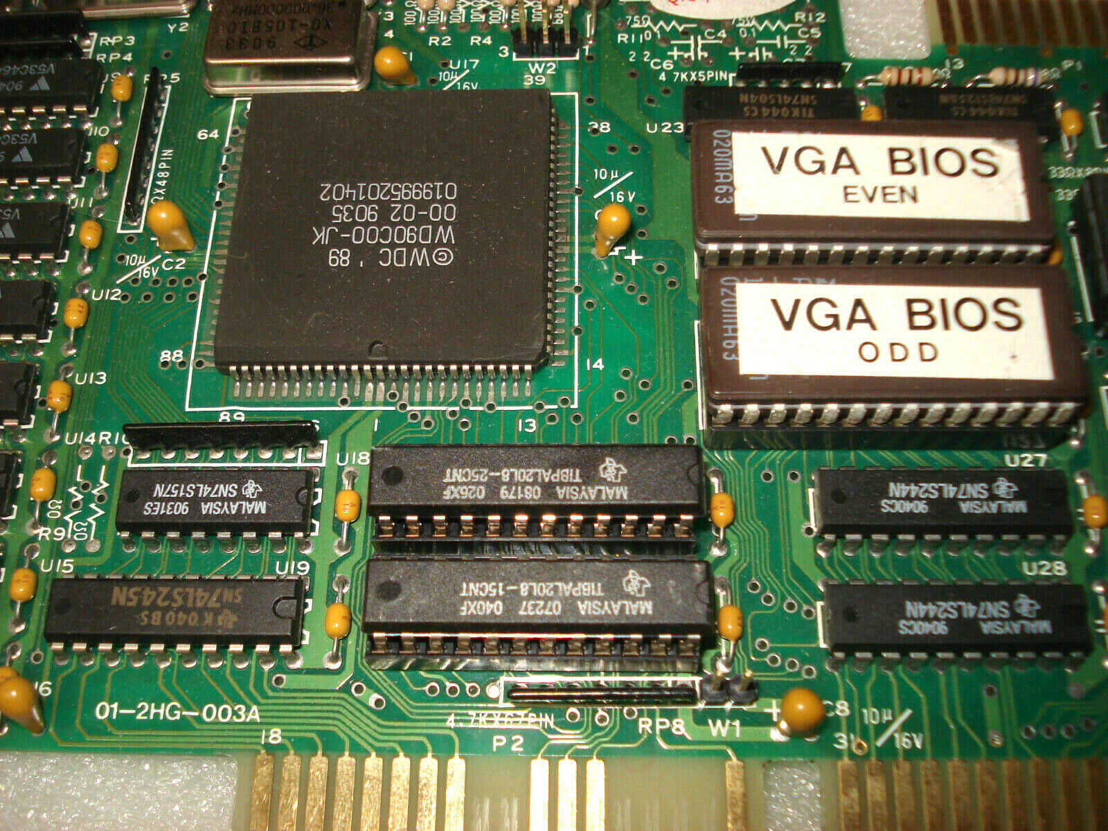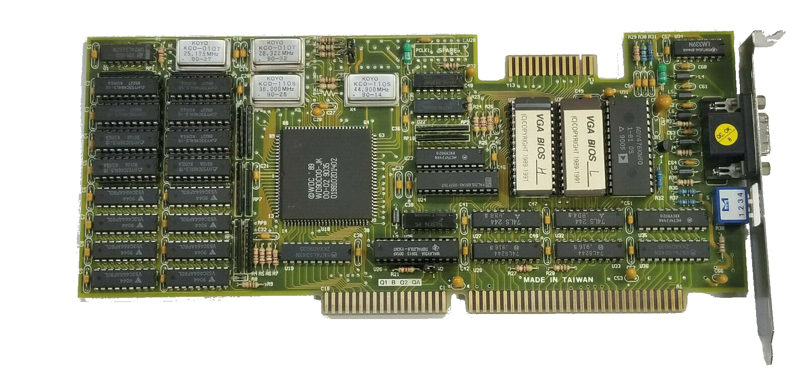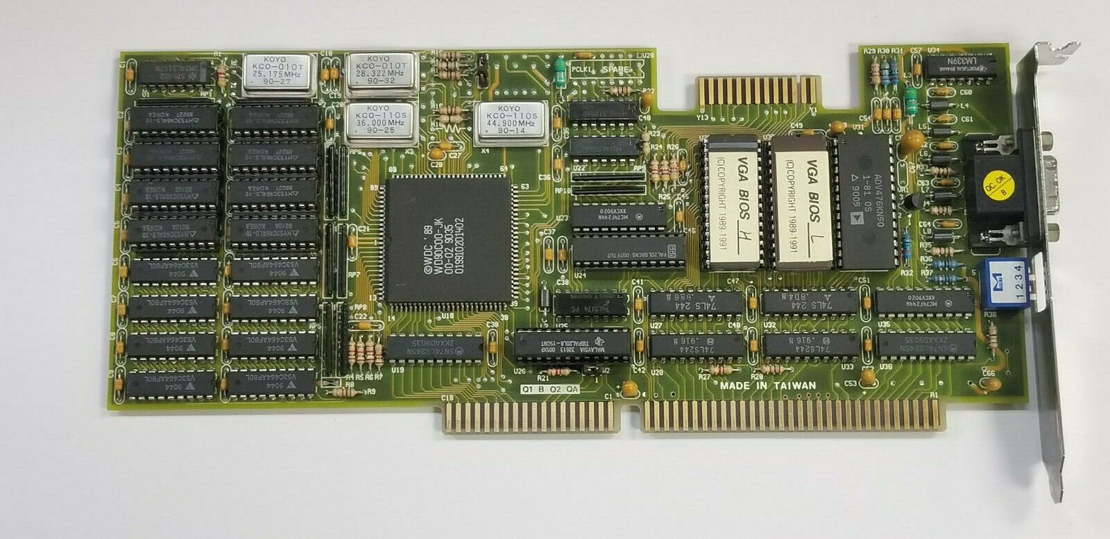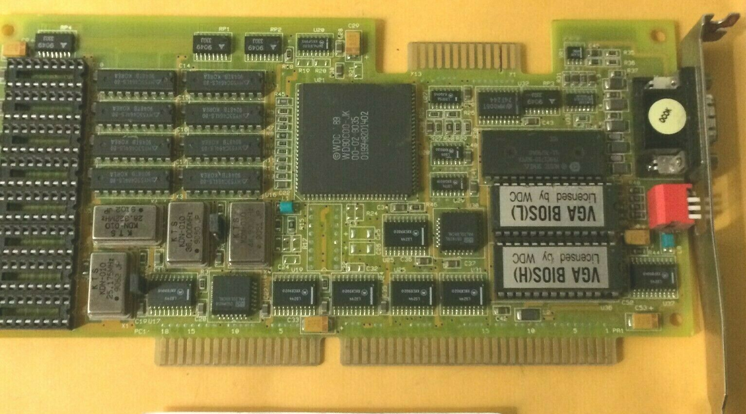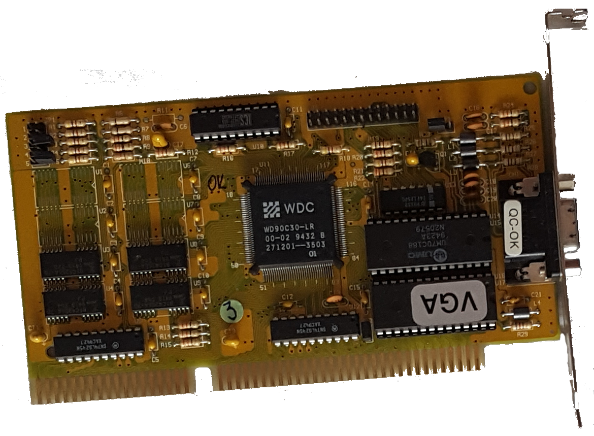 An "Enhanced VGA controller" from Western Digital - the WD90C11-LR chipset. The WD90C11 used a 1.25 micron process, and WD90C11A used the later 0.9 micron process for manufacture. Highlights of the chipset include: