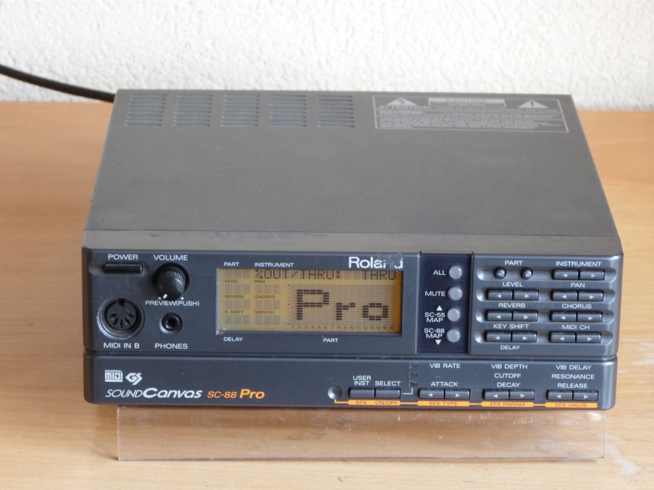 A cut-down sound module that supports General MIDI only. Unlike the SC-55, there is no MT-32 mode nor support for Roland's GM extension, GS). It provides up to 28 voices (channels) with 128 sounds and 6 drums in the onboard ROM. The sames are 16-bit at 32 kHz. It can also perform chorus, reverb and delay effects.