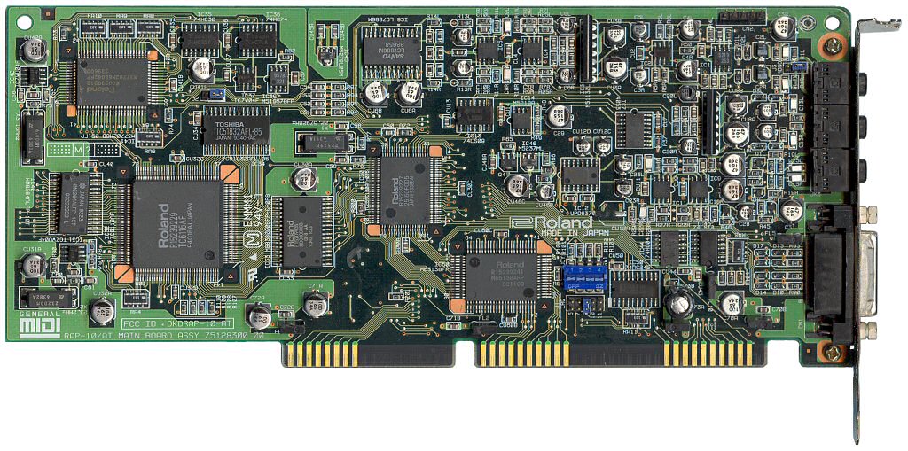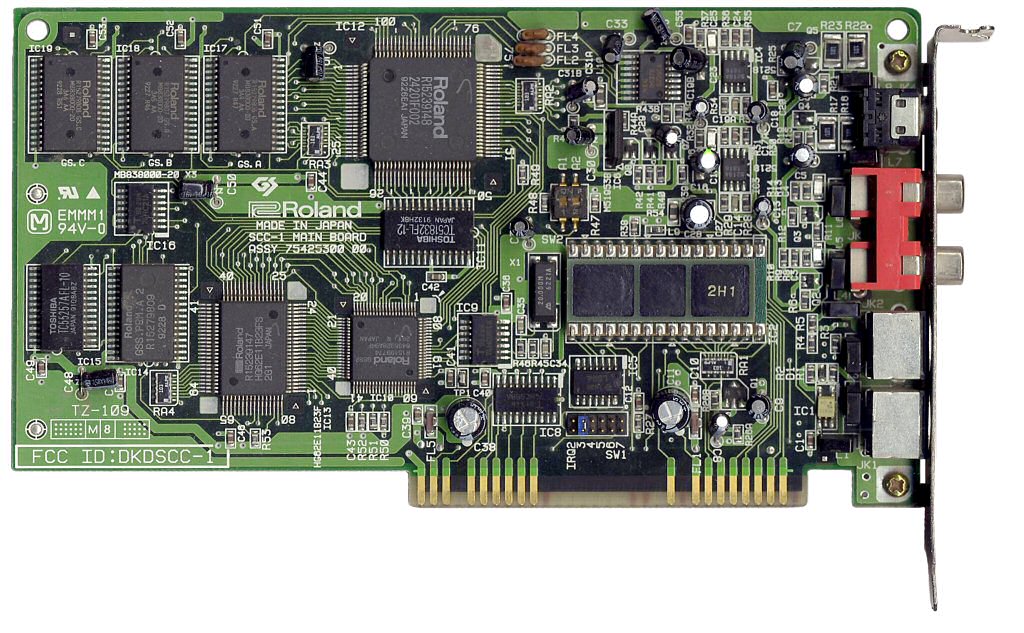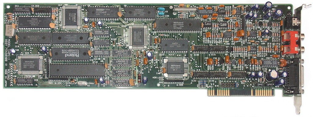 Designed to be for professional musicians. An SC-55 integrated onto an 8-bit PC card. Roland's first card to support their extension of the General MIDI standard, "General Synthesizer" (GS). 24 channels, 4 MB sample ROM containing 317 sounds (version 1) and 354 (version 2), mixed in 44 kHz (CD quality). MPU-401-compatible interface onboard. It could also run in MT-32 compatibility mode, but no samples could be uploaded (which a lot of games did), so not particularly suitable for PC gaming. Added chorus capability which was lacking on the LAPC-I.