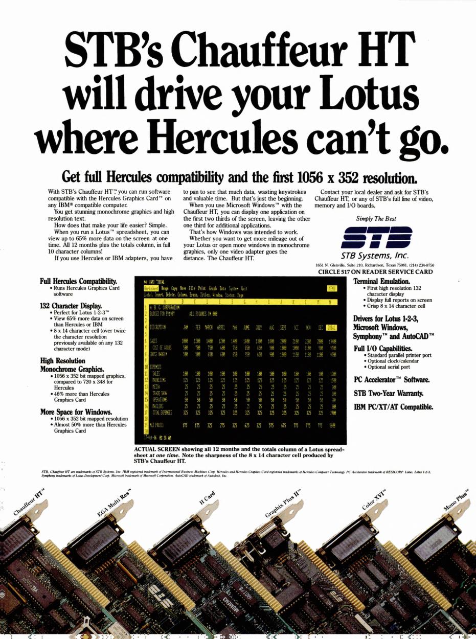 The Chauffeur HT was a Hercules-compatible card that supported for the first time a resolution of 1056 x 352, ideal for a 132-character wide display in text modes. It came with drivers for Microsoft Windows, AutoCAD, Lotus 1-2-3 and Lotus Symphony.