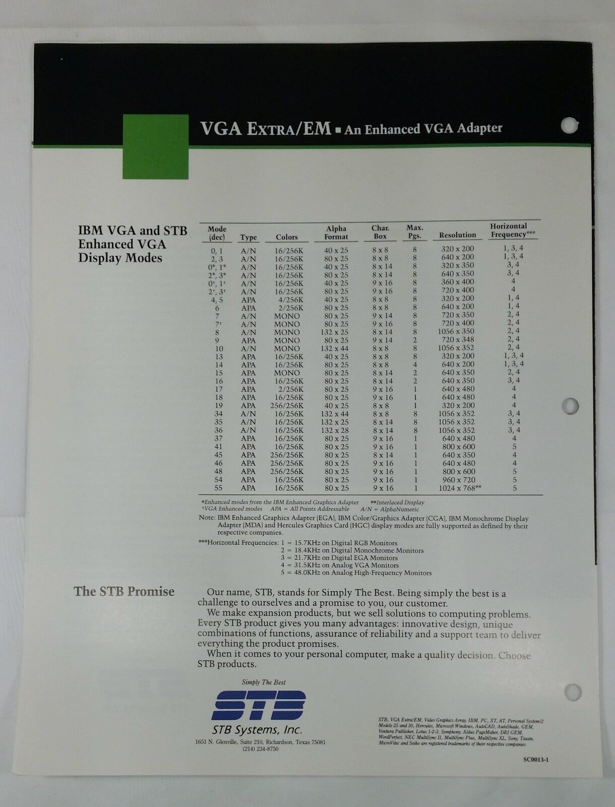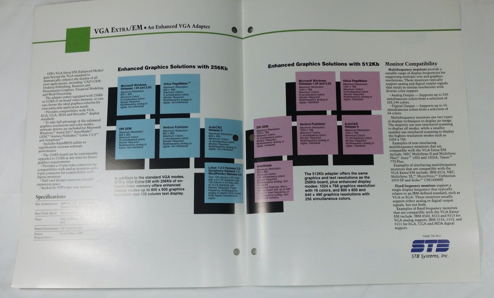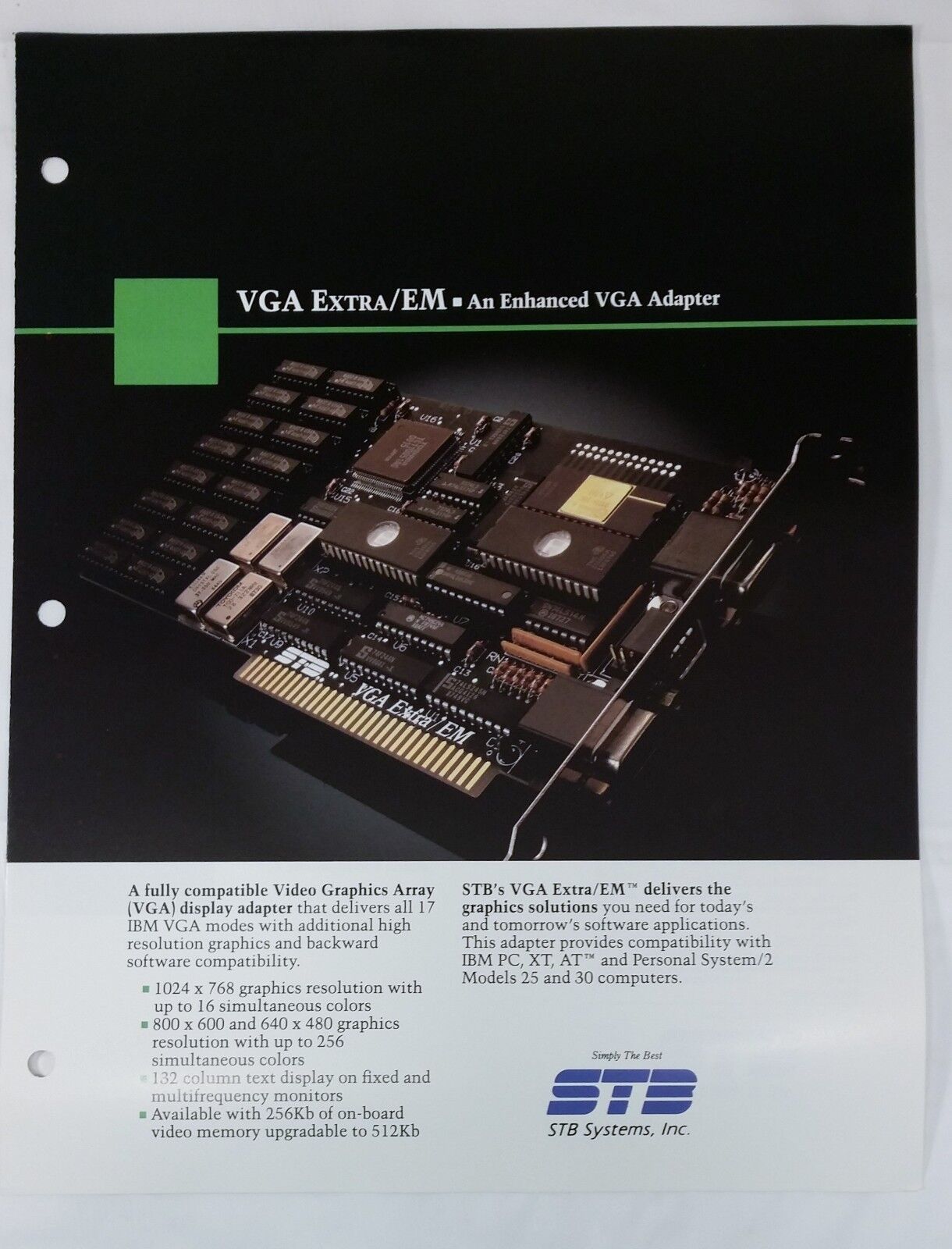 The VGA Extra/EM was one of STB's first Super VGA cards, supporting resolutions of up to 1024 x 768 (interlaced) in 16 colours and 800 x 600 in 256 colours. Based on the Tseng Labs ET3000 chipset, it supported all the IBM VGA standard video modes including the extended text modes up to 132 columns by 44 rows.