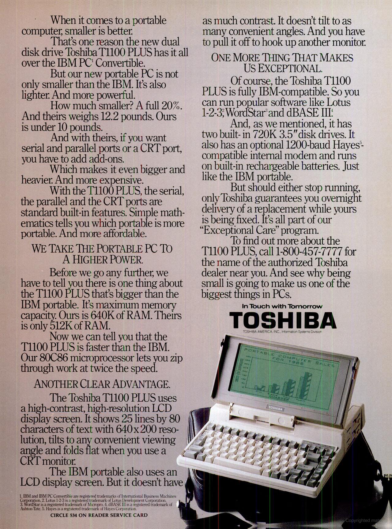 shows up in the sculpted lines of its plastic shell and its logical keyboard layout. It travels well across town or across the country. Wait no longer if you need a computer that goes where you go: the Toshiba T1100 Plus is it." PC Magazine, January 1987