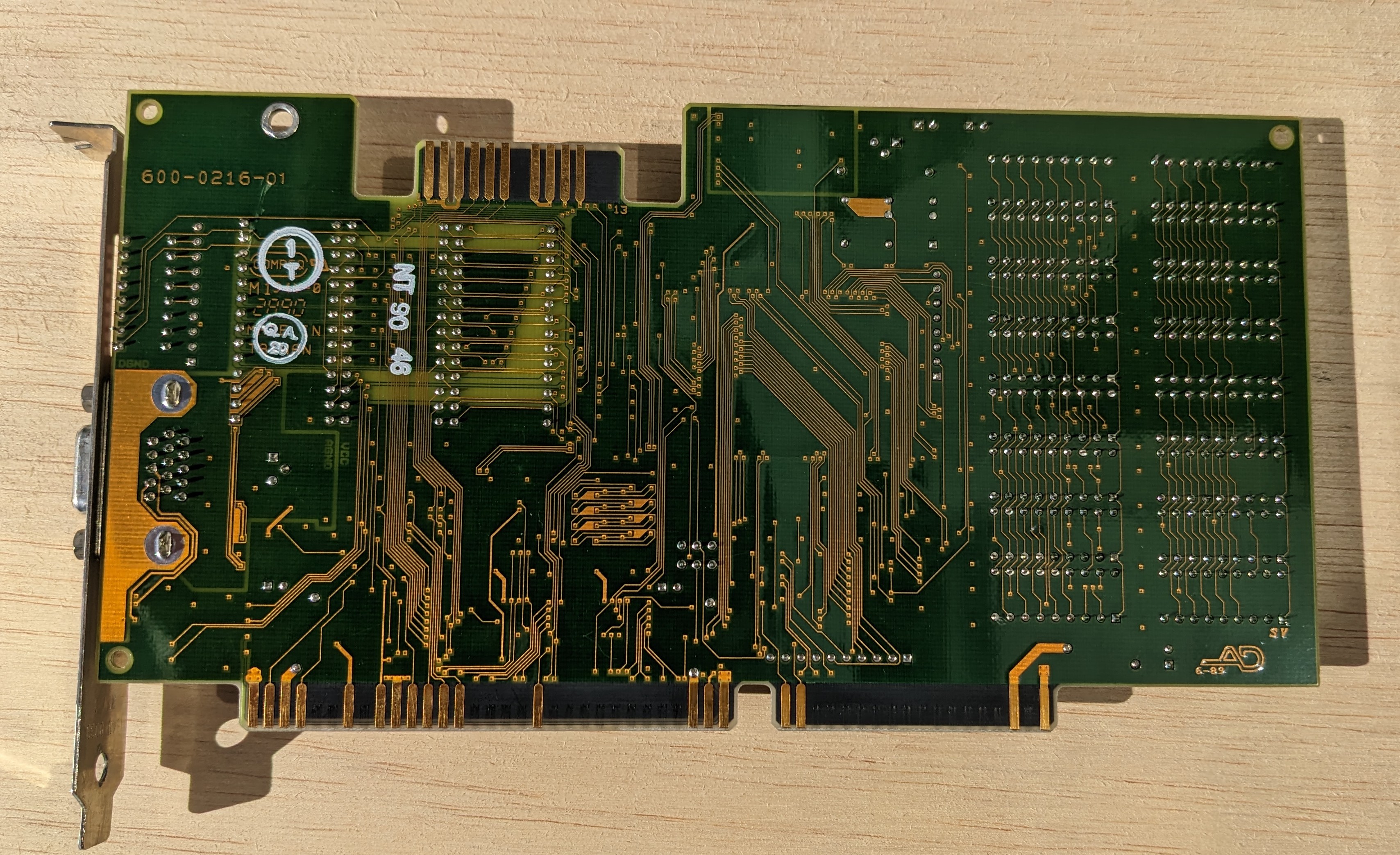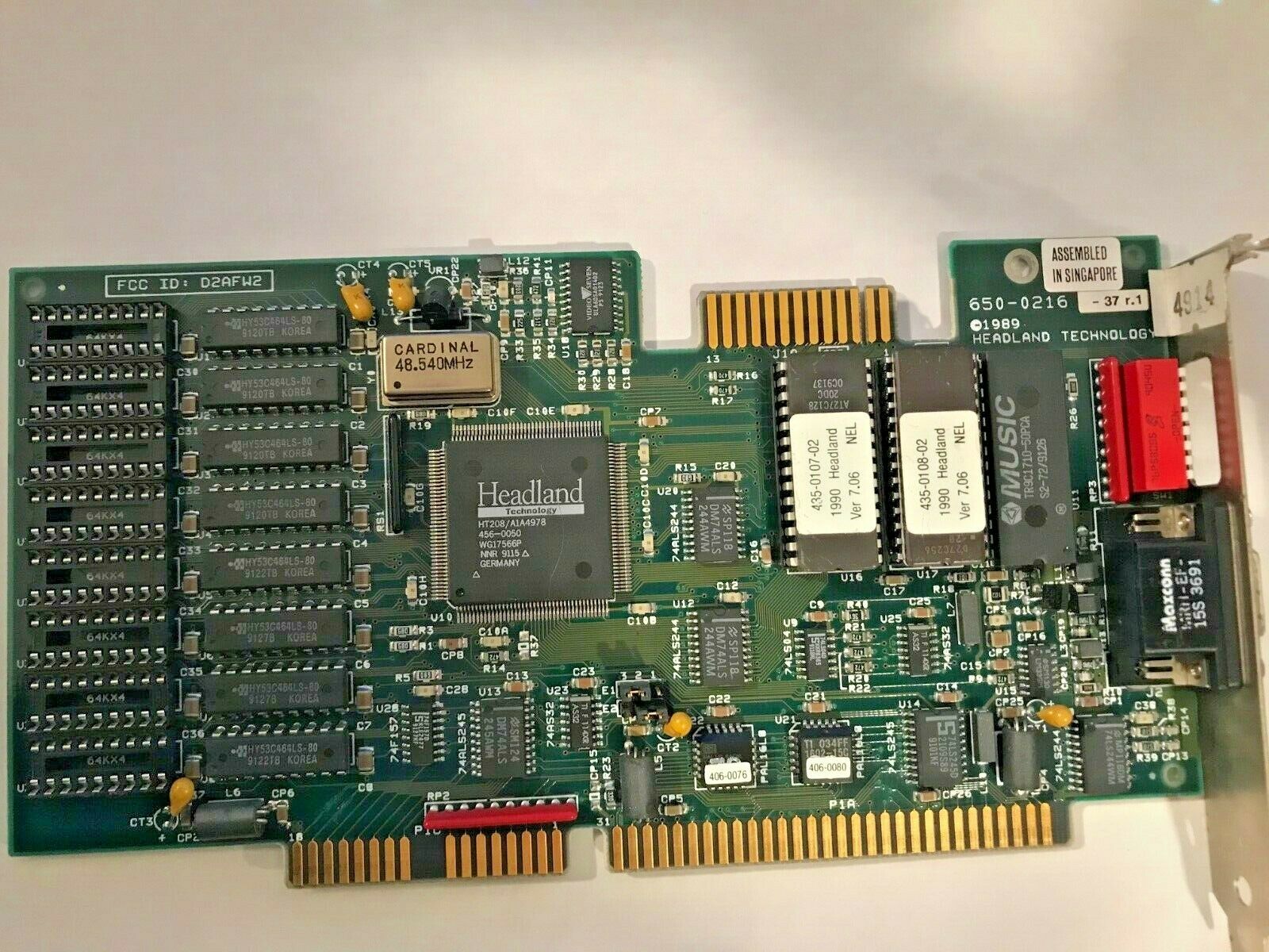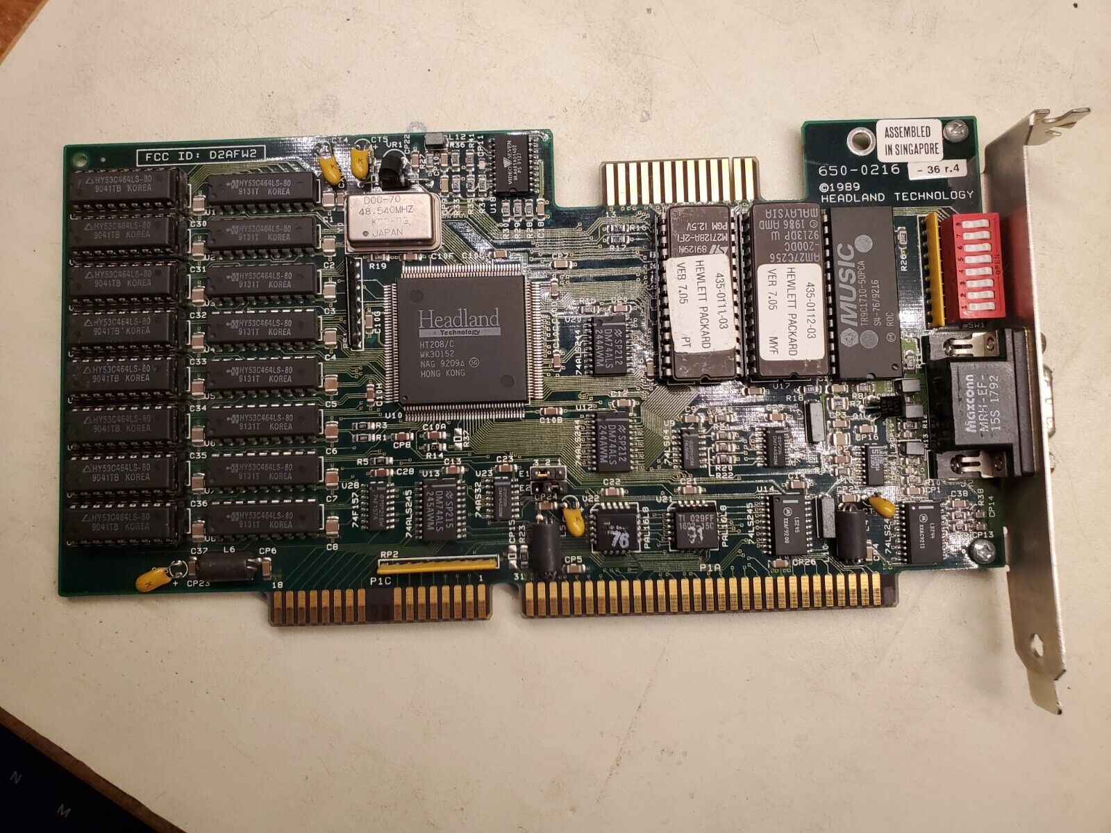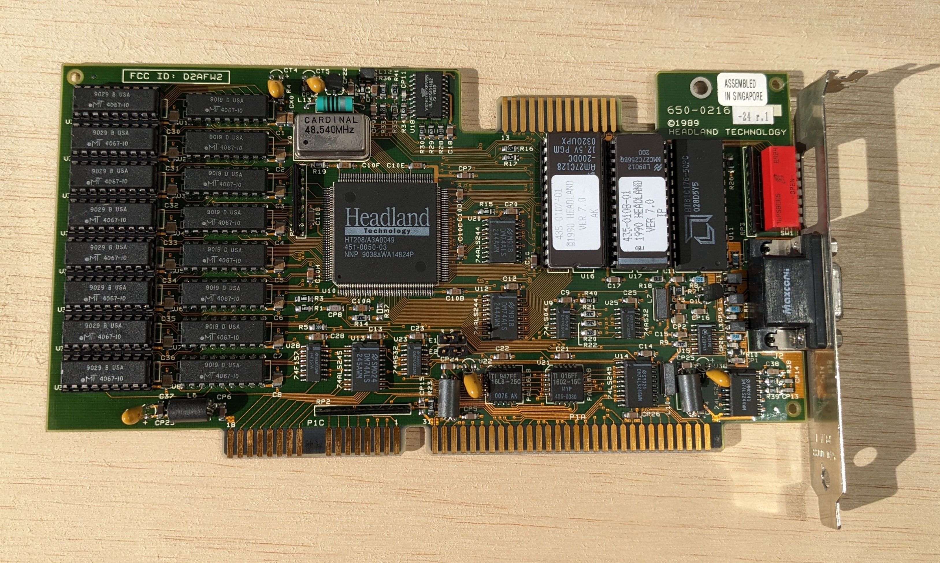 Part #: 650-0216-23 r.1 Main Chip: Headland HT208 dated Week 34, 1990 RAM: 512 KB (256 KB of Samsung KM41C464 (100ns) in bank 0 and 256 KB of Mosel Vitelic V53C464AP (70ns) in bank 1) DAC: AMD Am81C176 50 MHz BIOS Chips: v7.0 AMD Am27C128 (16 KB) v7.0 National Semiconductor NMC27C256 (32 KB) |