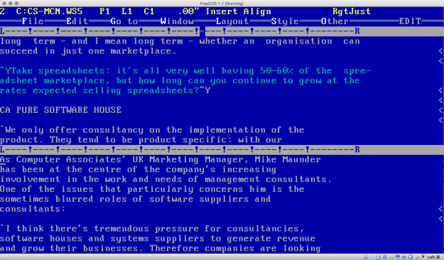 If you want something like a three-column piece of text in the middle of single-column copy, you have to set the rulers for each bit yourself. However, WordStar 5 allows you to define up to 10 standard rulers, which makes life easier for people producing things like newsletters to standard formats.