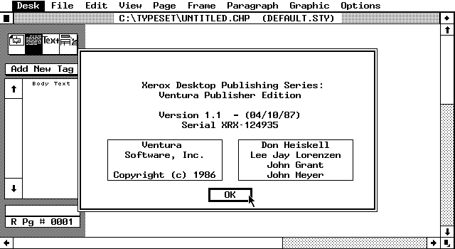 First released in 1986, it was developed by Ventura Software, a small company founded by John Meyer, Don Heiskel and Lee Jay Lorenzen. It was distributed by Xerox and others from its first shipment until the source code was eventually sold to Xerox themselves in 1989. Written in assembly language, it was restricted to only run in the first 640 KB of RAM. To allow it to use more would require the purchase of the "Professional Extension", which gave access to extended memory among other features.