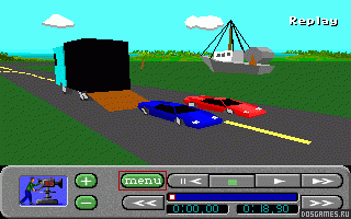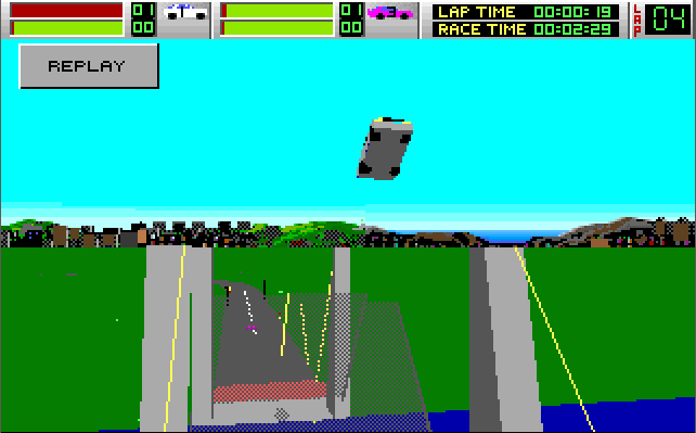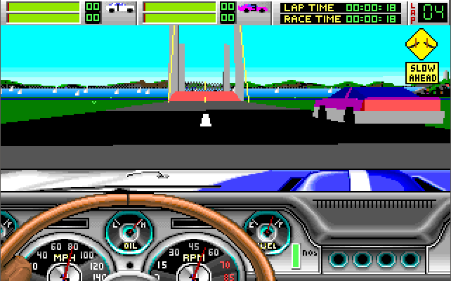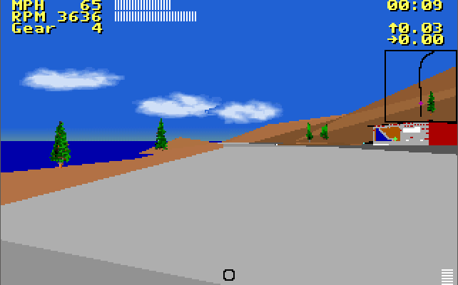 The game has a good frame rate but sadly the 'feel' of driving the car is far too simplistic and arcade-like. The car has no sense of weight to it, and the driving physics are incredibly basic. This detracts from what could otherwise be a fun driving game. The VGA graphics aren't used to the full, looking much closer to 16-colour EGA apart from a few telltales like the gradiated sky and distant landscape. You do have the freedom to go 'off-piste' but really it's a track-based racer, and your car doesn't drive well off the black stuff.