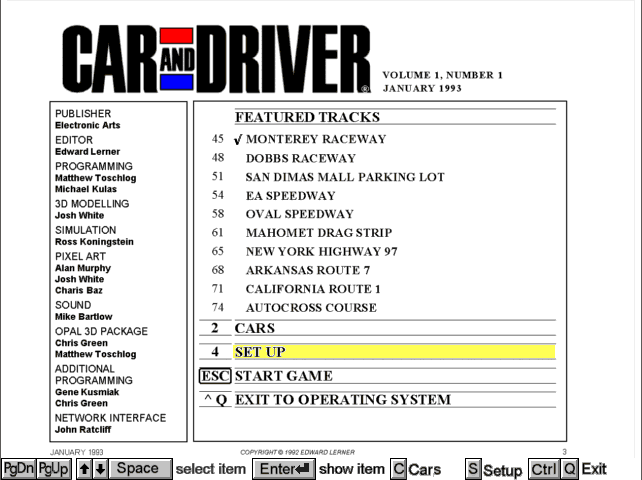 Car & Driver was sponsored by the publishers of the Car & Driver magazine. To this end, the game's configuration is made to appear as though you're thumbing through the magazine. The focus in this game is on the car - ten in all, including the best from Ferrari, Lamborghini, Lotus and Porsche, plus a good number of others.