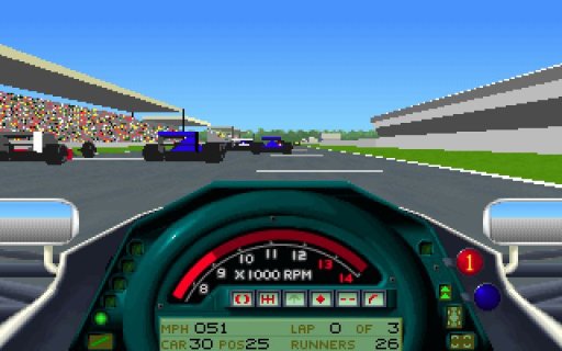 Sound: Who thought it would be a good idea to have music playing while you're racing a Formula One car?! You can switch this off in the in-game settings using F1, but still... The car's engine sound is also just wrong - F1 cars are supposed to scream, but in GPU it's muted and soft, and this detracts from making you feel like you're driving in Formula One (note: I only tested the Sound Blaster mode, so MT-32 might be better in this regard). 5/10