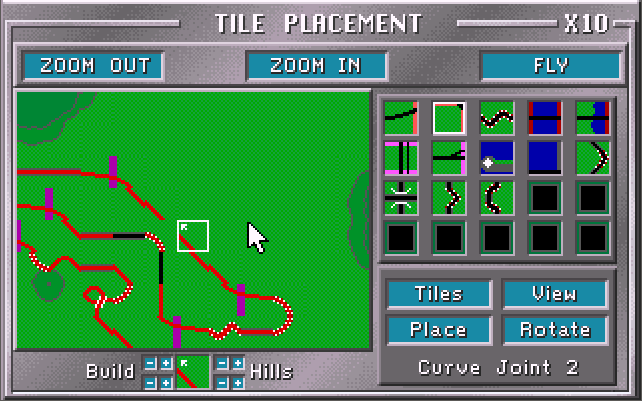 One welcome addition in GPU is the 'Architect'. Selectable from the main menu, it allows you to design your own racing circuit - a first for a Grand Prix game! You're given a slightly different rendition of the music from Test Drive III as you create your track. There are two views when in this mode: in the initial zoomed-out view, you define the course route which allows the game to understand which route the computer-controlled cars should take. Clicking on 'Zoom In' is where you can lay the various track tiles. It feels a bit clunky compared to some other course designers like the one in 4D Sports Driving, but using shortcut keys helps speed things up. The 'Fly' option gives you a controllable helicopter view of the track where you can check everything looks good before committing your changes, and you can also switch to this mode during a race by pressing F4.
