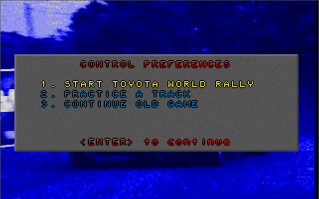 Toyota Celica GT Rally runs in either 16-colour EGA or 256-colour VGA mode, and supports Ad Lib, Sound Blaster, and Roland MT-32 sound. After choosing your level of steering sensitivity, you are presented with a screen that mis-names the title as 'Toyota World Rally'.