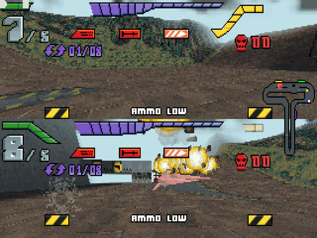 There are six vehicles in the game, and each one is rated by its speed, armour, weight, and firepower. Some are fast but are lacking in armour or weapons loadout. Others are slow and heavy but are built like a tank. You cannot change your vehicle between races in the Championship mode so there's no strategy to choose the right vehicle for each track.