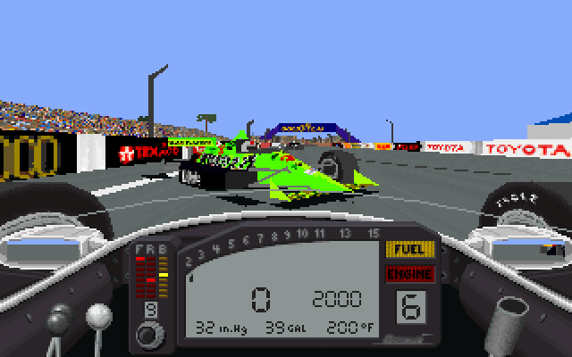Indycar Racing ran only in 256-colour VGA graphics mode, and in the now standard 320 x 200 resolution. This gave you the best blend of retaining decent frame rates while offering good enough resolution.