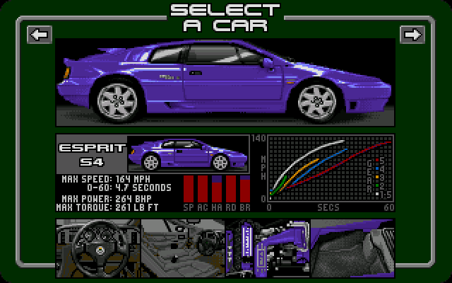 Race either against the clock or an opponent over numerous types of track including desert, mountain, windy, space(!), forest, and quite a few more. These can be laps around a circuit or point-to-point like a rally. You get to choose from three Lotus cars: the Esprit S4, Elan (which had the development code of M100), or the M200 prototype. Each race you complete opens up a code that you can write down and re-input later to jump to that race.