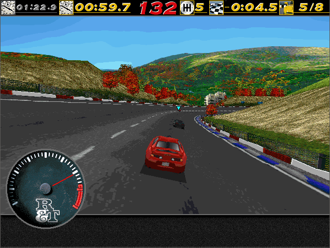 A total of six tracks came with the original: Rusty Springs Raceway, Autumn Valley Speedway, Vertigo Ridge, City, Coastal, and Alpine. Three of these are 'open road', three are closed circuits and one is a bonus track that's unlocked later. You can race on these in a number of game modes: Head-to-head, Single Race, Tournament and Time Trial. In the first two, you race against a single computer opponent or another human player over modem connection. In Tournament you take part in all the tracks, competing against 7 computer-controlled cars. Depending on the car you choose, you are put into Tournament Class A, B or C, so you complete against similar-specced cars. You must complete every track in 1st place to progress. The Time Trial is just as it sounds: a race against the clock to get the fastest time with no cops or other traffic to get in your way.