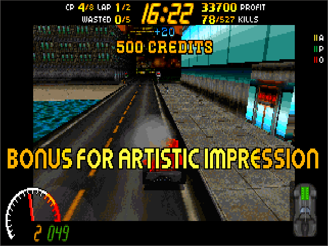 As you win races and/or cause carnage, you earn points which are instantly available to you to repair your car (with Backspace) or recover your car if you cannot get back on the road or onto four wheels (with Insert). At the end of the race all the points remaining get converted into a score that move you up or down in the ranking.
