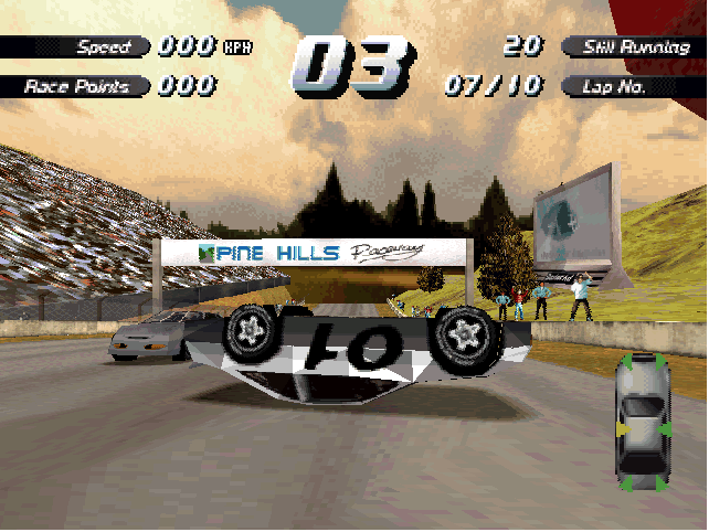 Sadly the static menu screens are at best boring and at worst non-intuitive or buggy. Entering your name using the cursor keys and enter isn't fun for a PC game, just time-consuming. Viewing lap times only shows the fastest five times for each track, so unless you're extremely good, you can't tell how far off the top you are. And when you reload from a saved game in order to go back to the Division you're in (you need to do this to unlock certain tracks) it forces you into the next race rather than returning you to the menu to choose what you want to do. Opting for multiplayer you have to enter your name, but then hitting [END] just reverts you back to entering your name. These screens could do with some textual feedback, like when you save actually print up a 'Game saved' message rather than just beeping. Oh, and there there's no music even though the menu has a CD Player option.