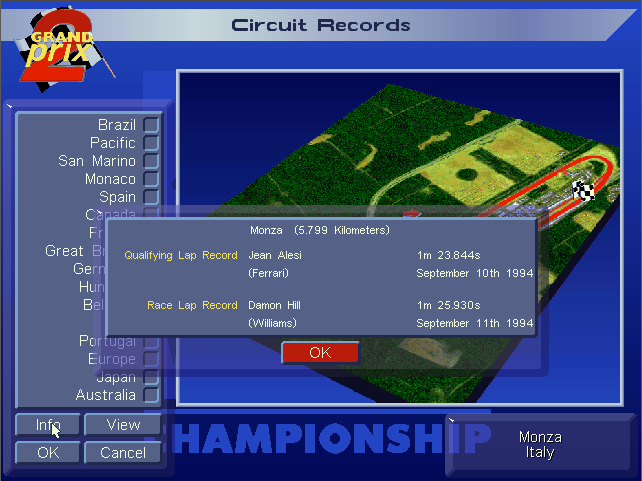 Gameplay: I cannot find fault with anything in GP2 regarding its gameplay. The full race season from 1994 is there, and the options to analyse your performance, tweak the car, save/load your settings are very welcome. With the actual teams, drivers, accurate circuits, and a rich set of options, there's little point in ever returning to F1GP once you've played GP2 - it's an all-round better game but manages to keep everything that made its predecessor the #1 title it was - well done MicroProse! 10/10
