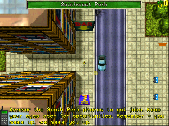 Unlike more modern GTA games in the franchise, this one was played from a top-down/helicopter view, where the slower you drove the more zoomed-in the view became. This effect worked really well, allowing you a good amount of visibility around your current location to not crash into everything in sight (unless that was the point).