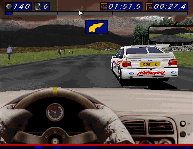 You get to choose from one of six rally teams and their cars: the Subaru Impreza, Ford Escort RS Cosworth, Renault Maxi Megane, VW Golf GTi 16V, Skoda Felicia, and Proton Wira, all of which are displayed in lovely detail. The game contains all of the 1995 Network Q RAC Rally's 28 segments. These are all based in the UK and range from forest and gravel tracks to tarmac roads, some of which are snow-covered!