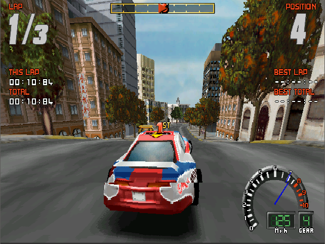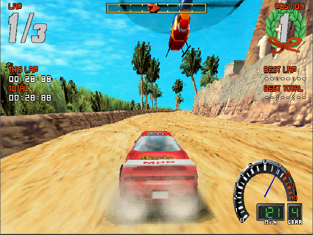 Gameplay: Despite the negative points I mentioned, I strangely kept going back to play this again and again. And it wasn't so much for the crashes - I love the fact that you can inadvertently go from middle of the pack to front runner purely because of the other drivers crashing and all you need to do is avoid the pile-up - it's fairly common. The championship layout is confusing, with different leagues you get promoted into or relegated from depending on your performance, but the points system doesn't make much sense - it's all rather disjointed as a game, like they added all these things at the 11th hour around a 3D driving game. The crazy destruction derby itself is highly disappointing compared to the track races - in 'Total Destruction' all the other cars aim straight for you - you really don't stand a chance, so what's the point in putting it into the game?! It's not clever or fun - having the ability to switch views so you could see to your sides or rear would have been a good idea, so you could plan your strategy a little more. 7/10