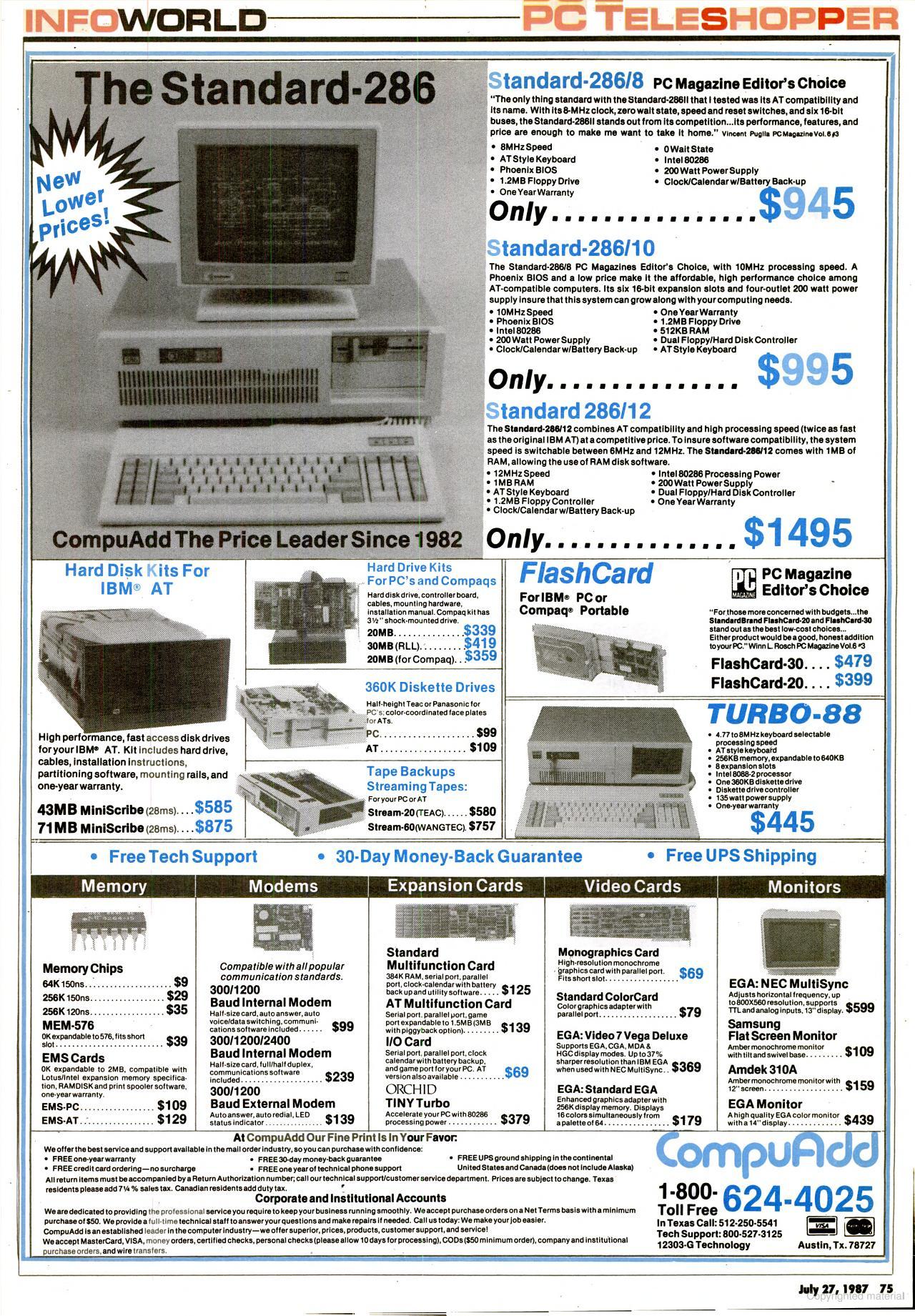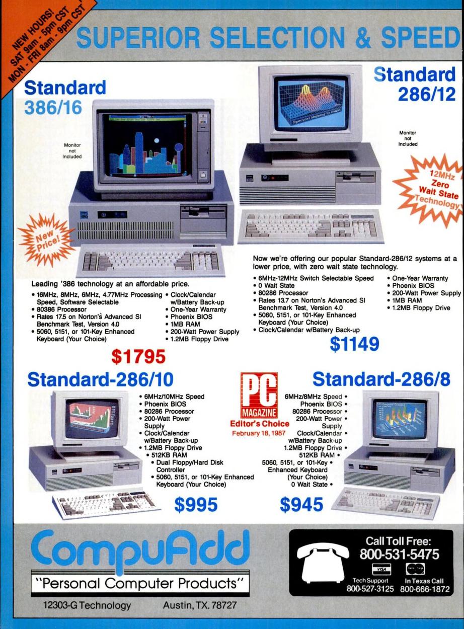 CompuAdd expanded their 'Standard Brand Products' line in April 1987. Their 4.77 MHz XT and the Portable were removed and the Turbo/XT model was replaced with a single Turbo-88 (8 MHz), though the specs were the same with just 256 KB of RAM as standard. The STD-286 (8 MHz) from last year was replaced with the Standard-286 II (also 8 MHz), which was now zero wait-state, but came with only 512 KB of RAM as standard compared to its predecessor's 640 KB. I would assume this was simply to keep the big font sticker price that first caught your eye on the advert to be as low as possible. They did of course offer memory upgrades which I'm sure most buyers opted for. Two faster 80286-based PCs were introduced: the Standard-286/10 and Standard-286/12, both of which also came with 512 KB of RAM.