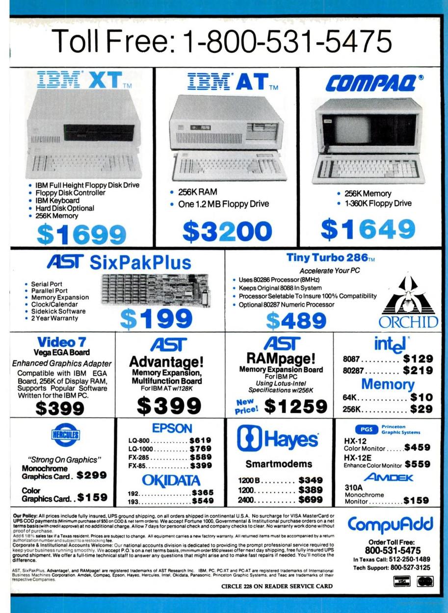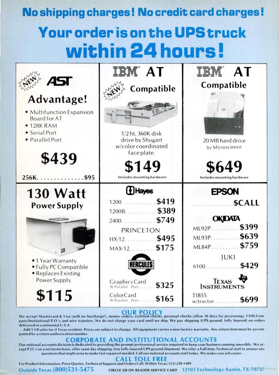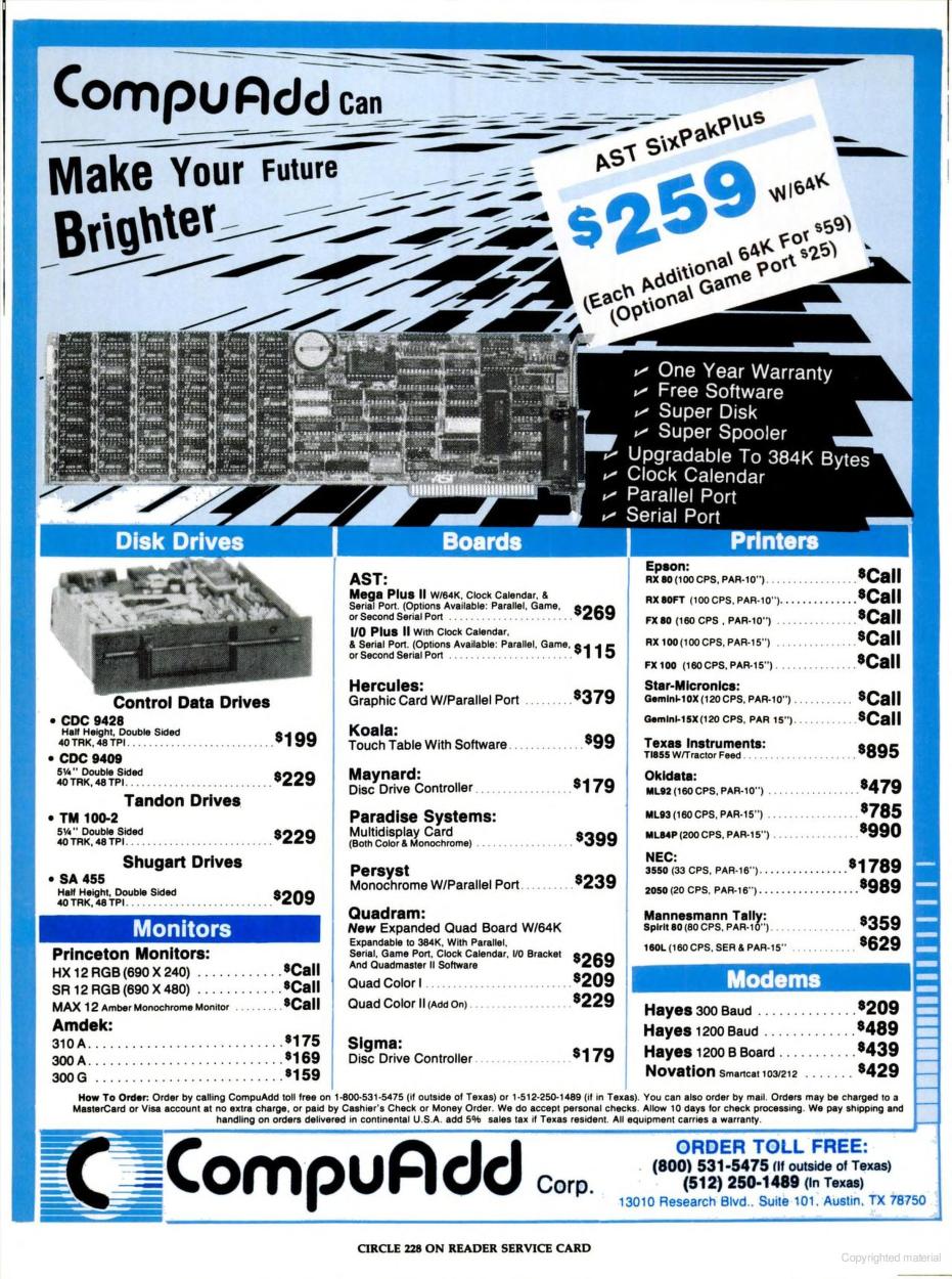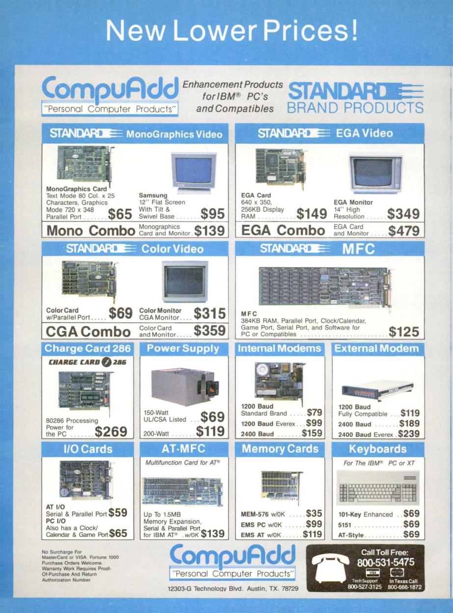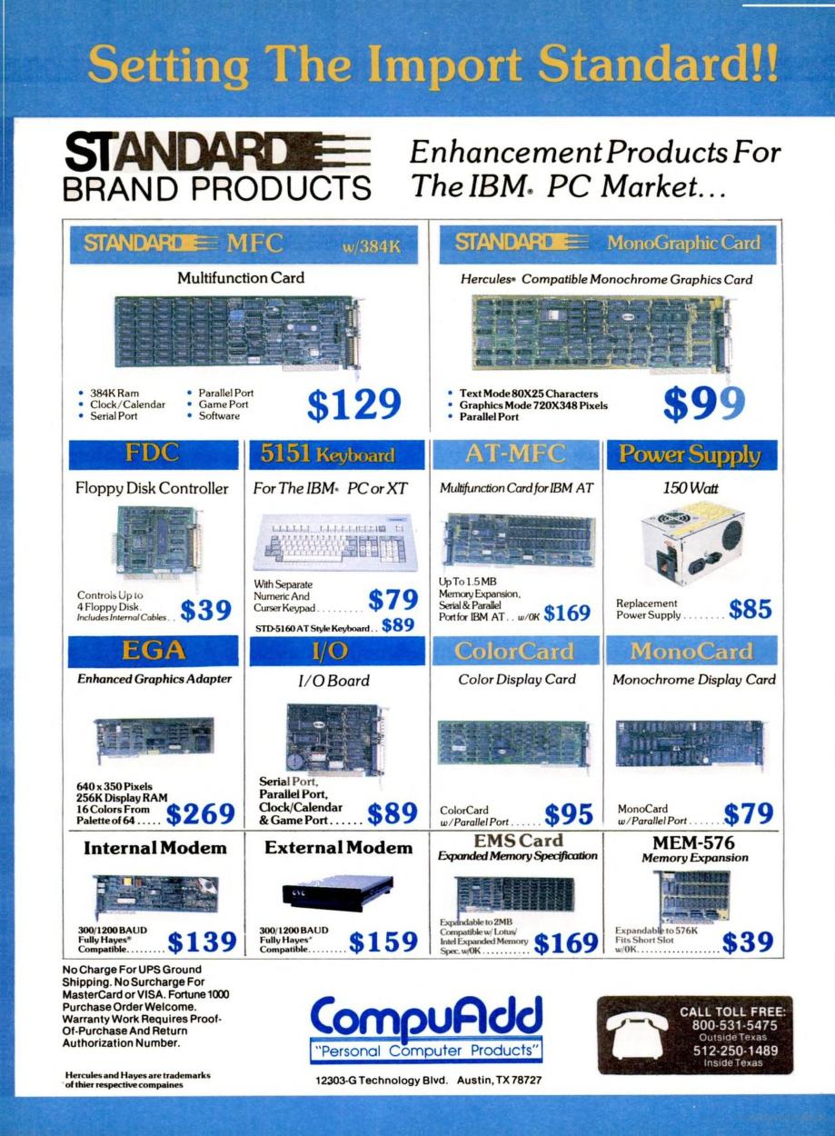 This is the period in which CompuAdd began putting together their own desktop PCs under their 'Standard Brand Products' line which comprised the low-end Standard PC/XT (4.77 MHz), the Standard Turbo/XT (8 MHz), STD-286 (8 MHz), and the Standard Portable XT machine. These were advertised with a base unit price, upon which you could then pick the graphics card and monitor of your choice/price point. In parallel with their own range, they were also authorised resellers for IBM and Compaq, and as you can see in their adverts below, a cost saving was easy to see.