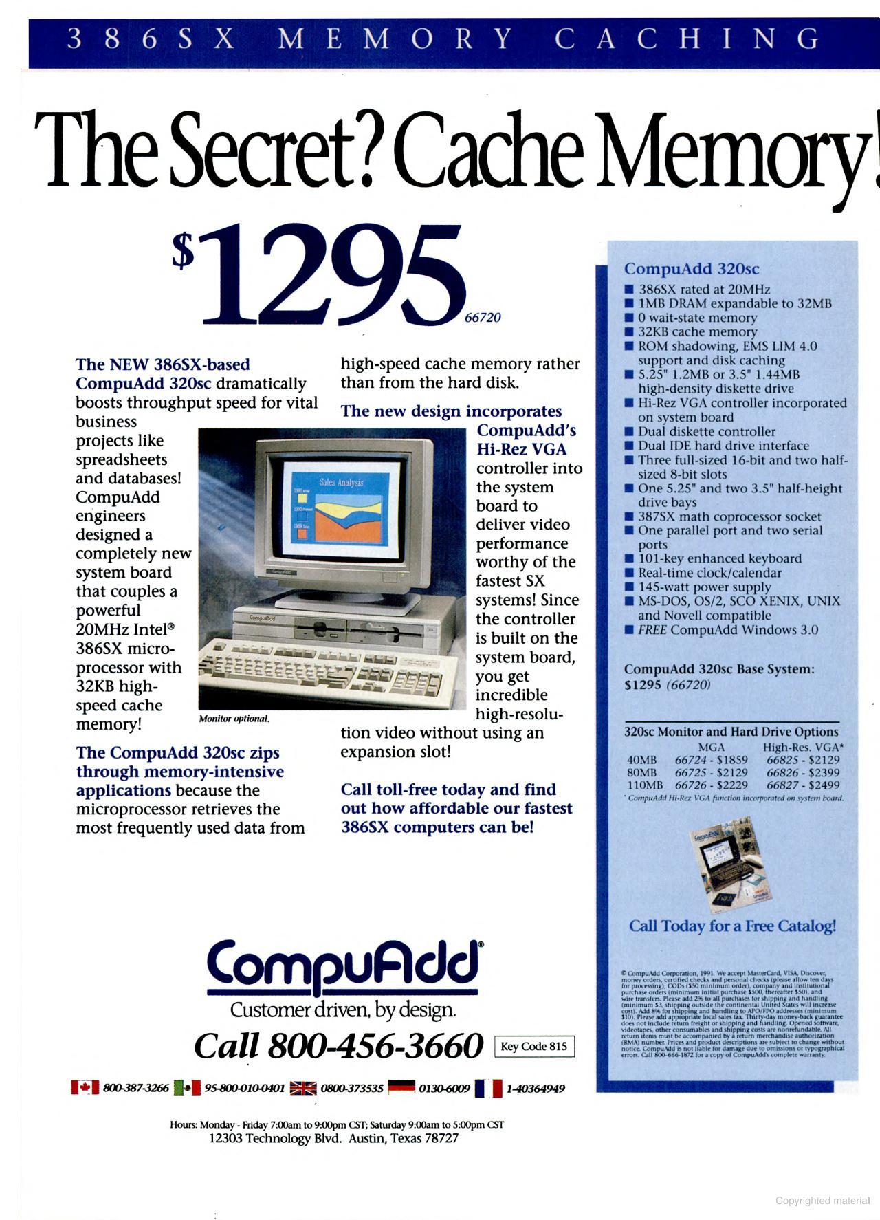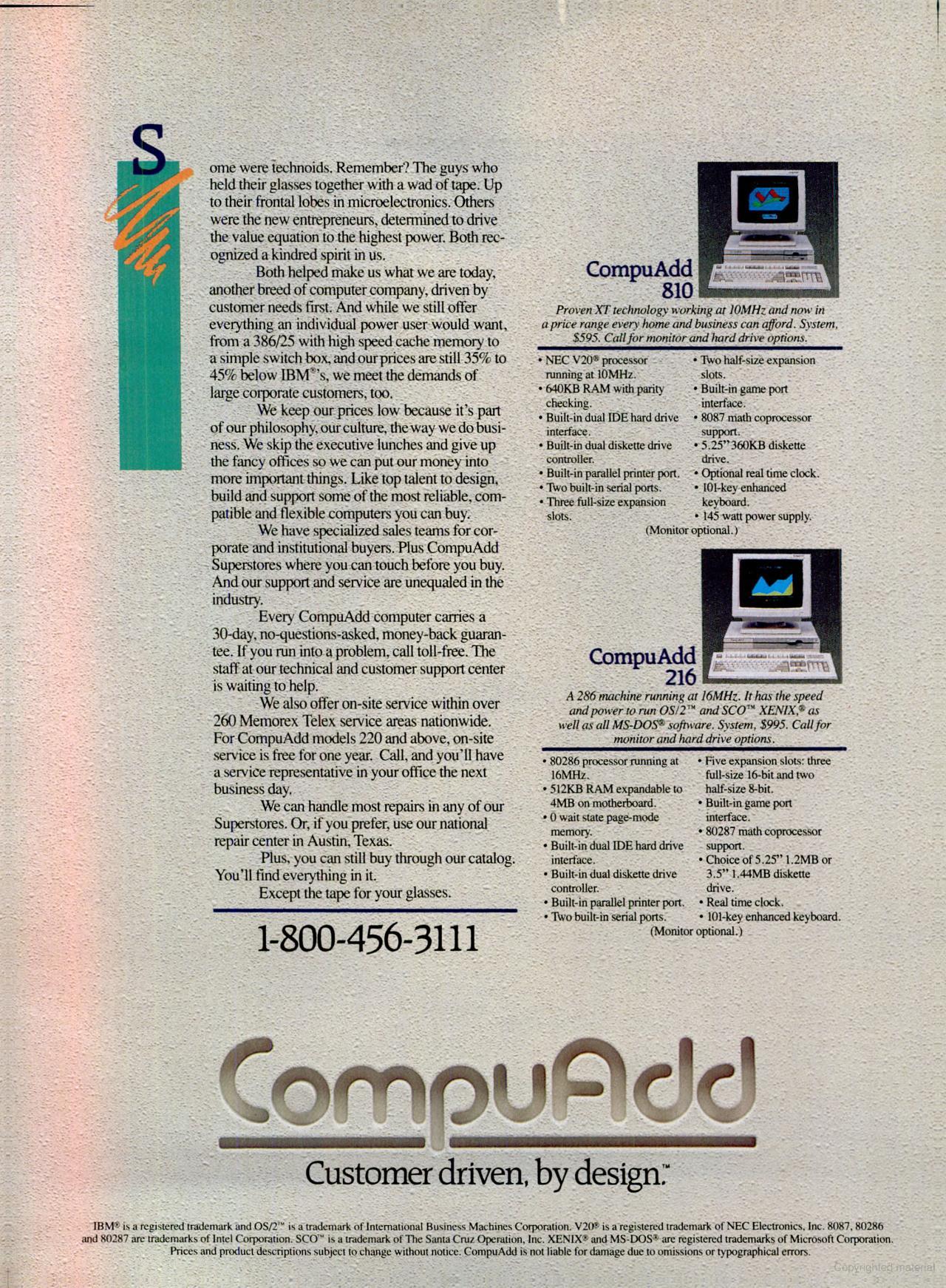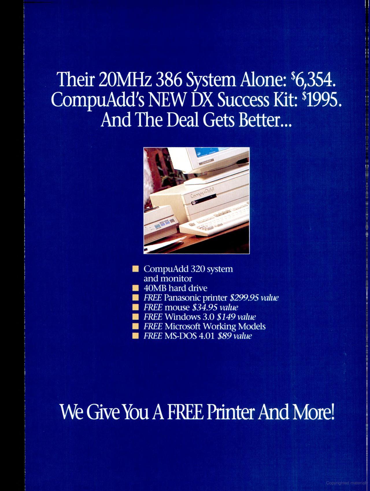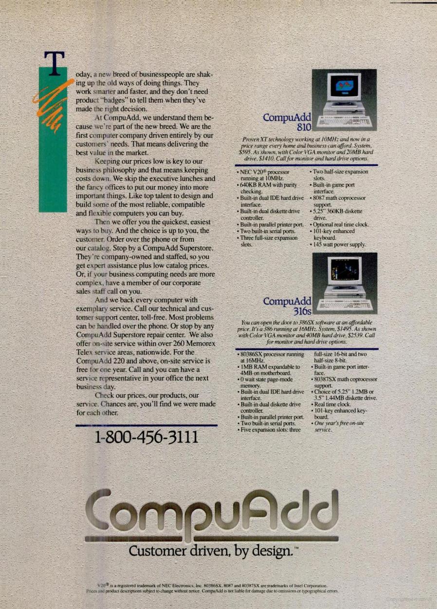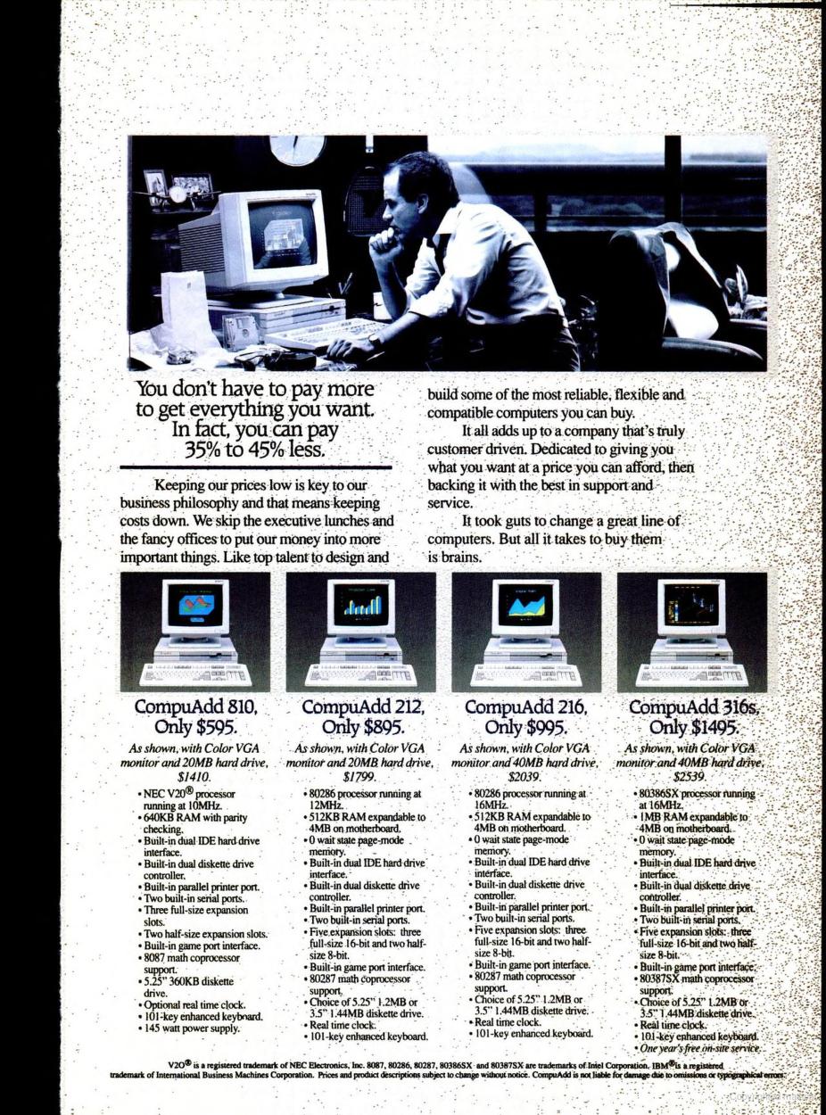 Again, the 286 range only came with 512 KB of RAM despite the fact the lesser NEC V20-based CompuAdd 810 came with 640 KB. The adverts aren't clear, but it's likely all the 386DX-based PCs came with 1 MB of RAM.