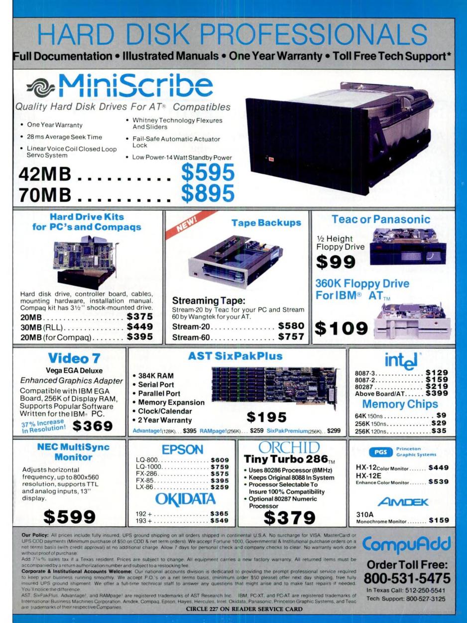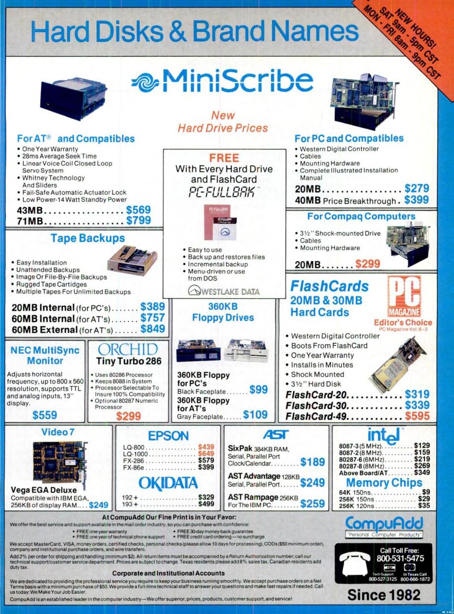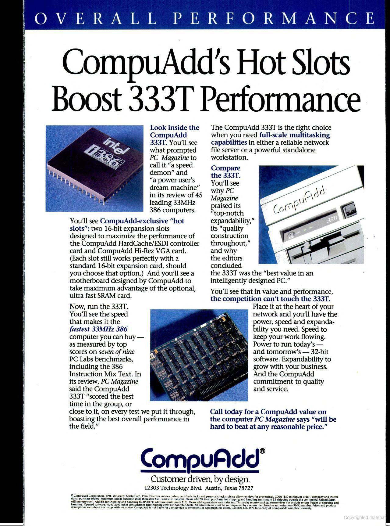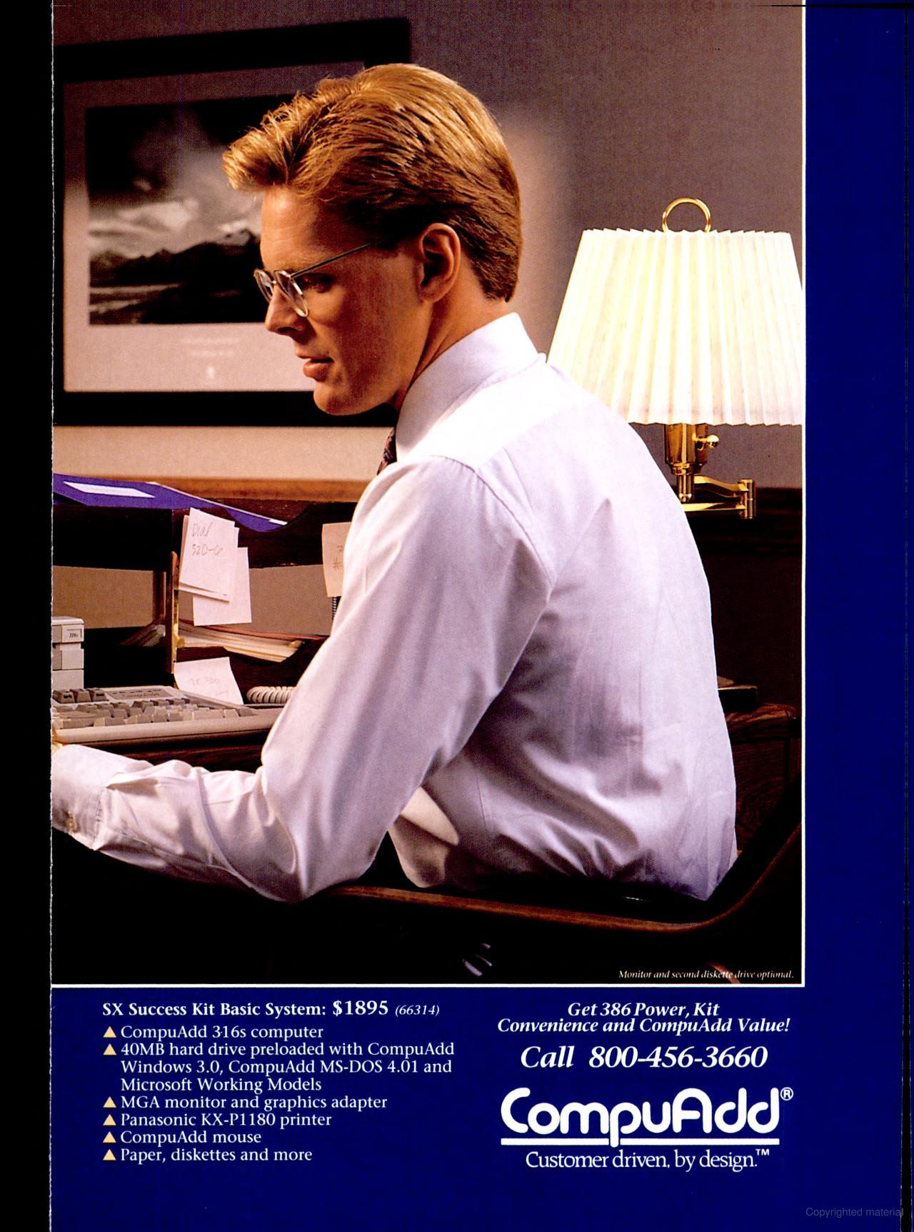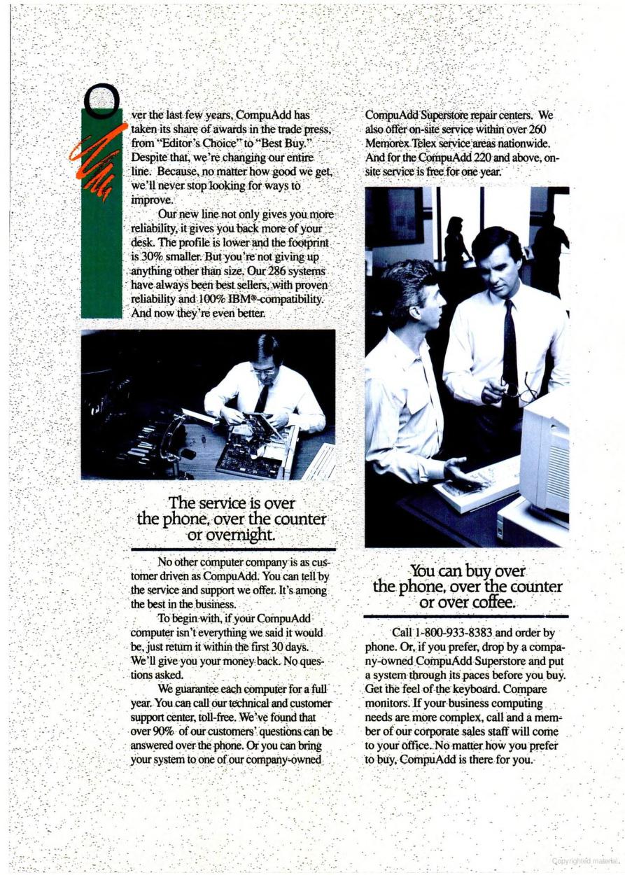 Again, the 286 range only came with 512 KB of RAM despite the fact the lesser NEC V20-based CompuAdd 810 came with 640 KB. The adverts aren't clear, but it's likely all the 386DX-based PCs came with 1 MB of RAM.