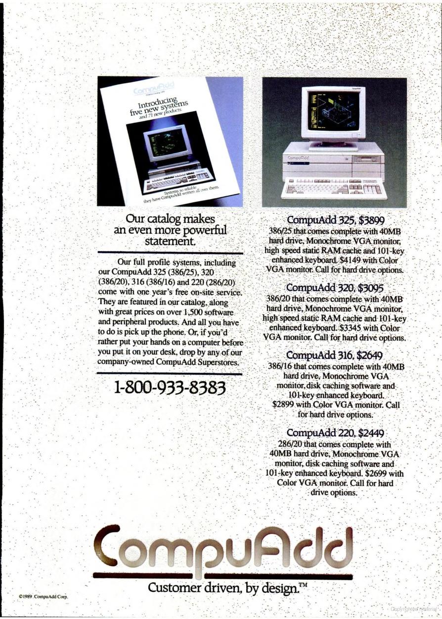 In early 1989 CompuAdd had 15 stores for direct retail sales, and by the end of the year they had expanded to 70-80 stores, but also continued to sell mail order via PC magazines with multi-page adverts. In mid-1989, CompuAdd's PC range comprised the 286/20, 386/20, and 386/25, all in desktop form factor.