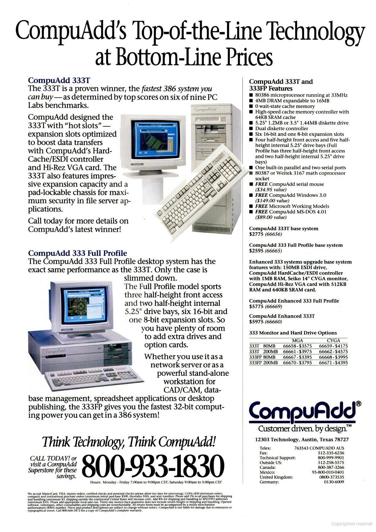 At the end of 1990, we saw the reintroduction of a portable, or rather, a laptop being sold by CompuAdd in the form of the 316SL laptop, bundled with Windows 3.0, MS-DOS 4.01 and more. The 325 was now complemented with the top-of-the-line 425 model (a 486DX-25 desktop), the 333T (386DX-33 in a tower case), and the 333FP "Full Profile" (slimmed down desktop case version of the 333T).