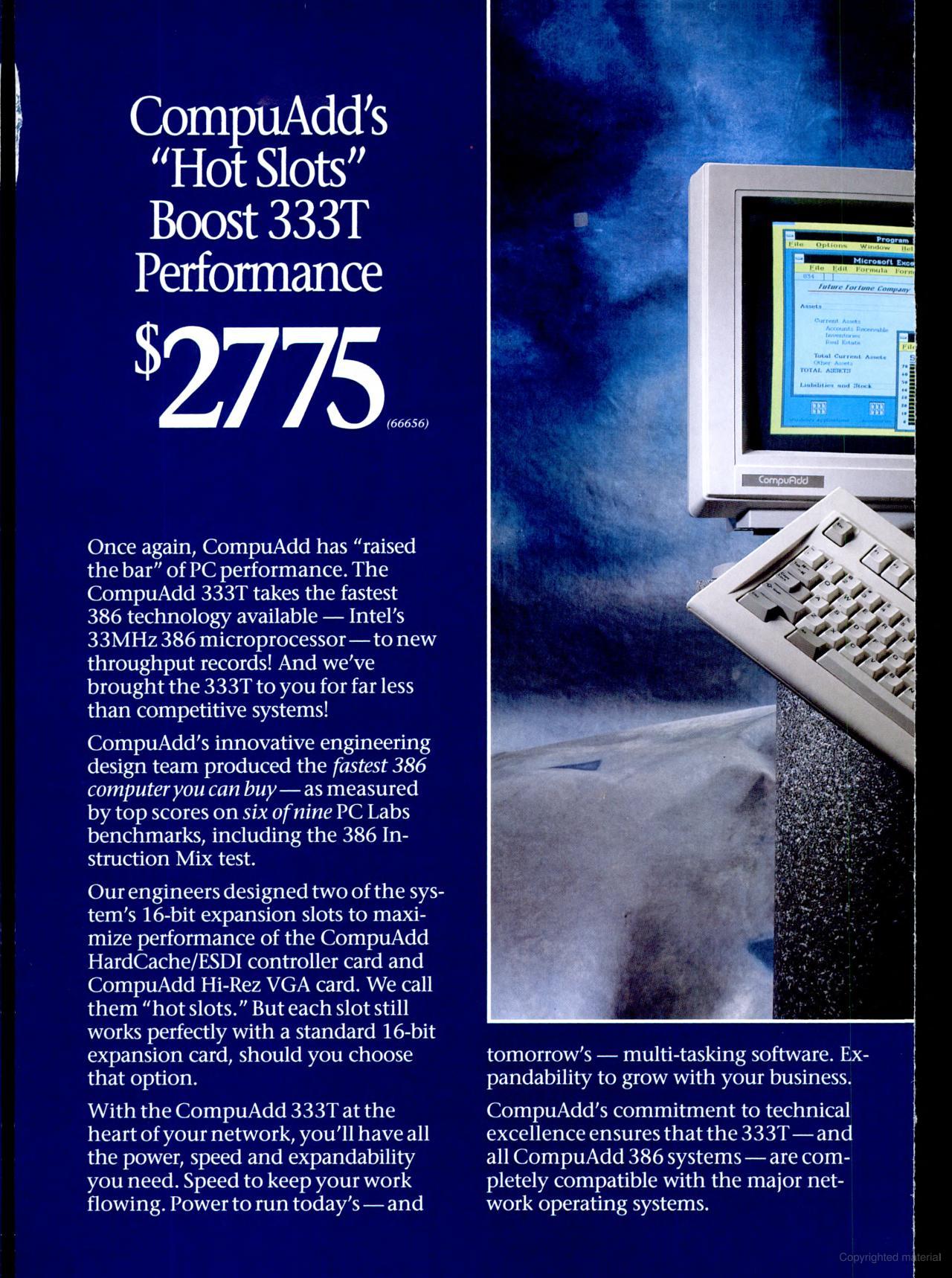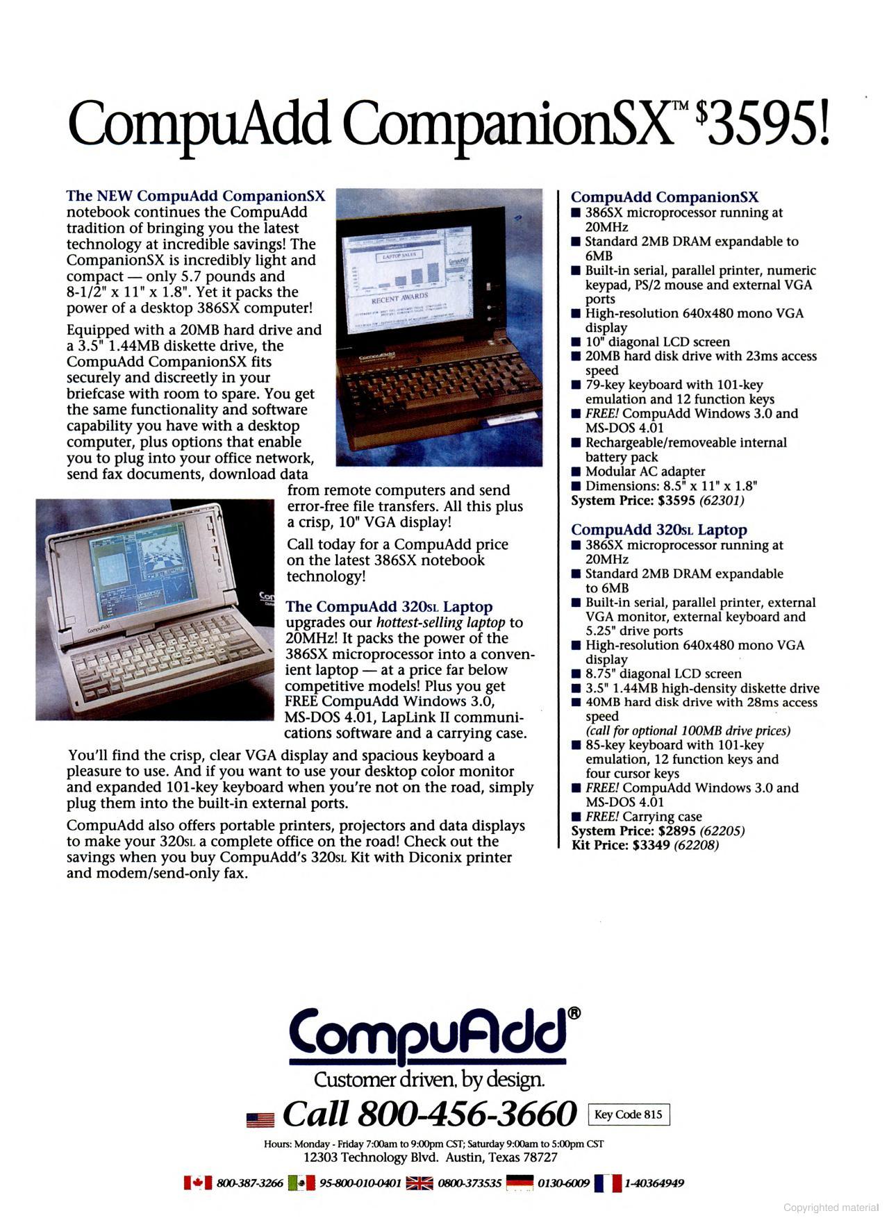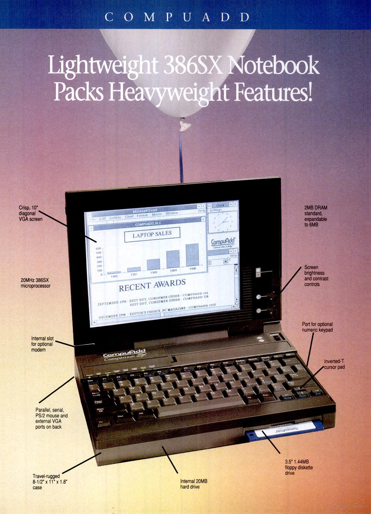 In mid-1992, CompuAdd still sold both desktop and notebook computers, though the latter was the bigger sales push. Their notebook range comprised the 325TX and 325TFX, both of which ran a 386SX-25 CPU. The 325TX came with 2 MB of RAM and a 10" [gas plasma?] screen while the 325TFX came with 4 MB of RAM, a 10" LCD display capable of 64 greyscales, and a built-in 2400 baud modem. Another advert in the same period showed off their new CompuAdd 486DX2/50 with its 4 MB of RAM and 64 KB cache.