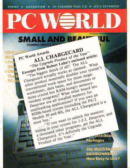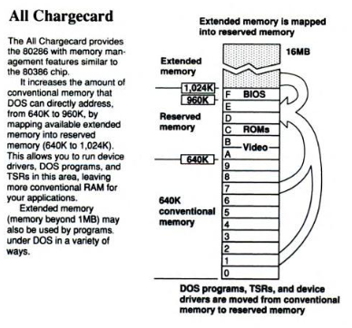 He's onto something with the Charge Card's ability to use EMS - the excerpts here from PC World and PC Magazine tell us it has expanded memory management capability, so it's less of a CPU performance boost as it is a hardware memory manager for systems that didn't directly support XMS or EMS in their chipset. It would be great to test any drivers and utilities that came with these cards!