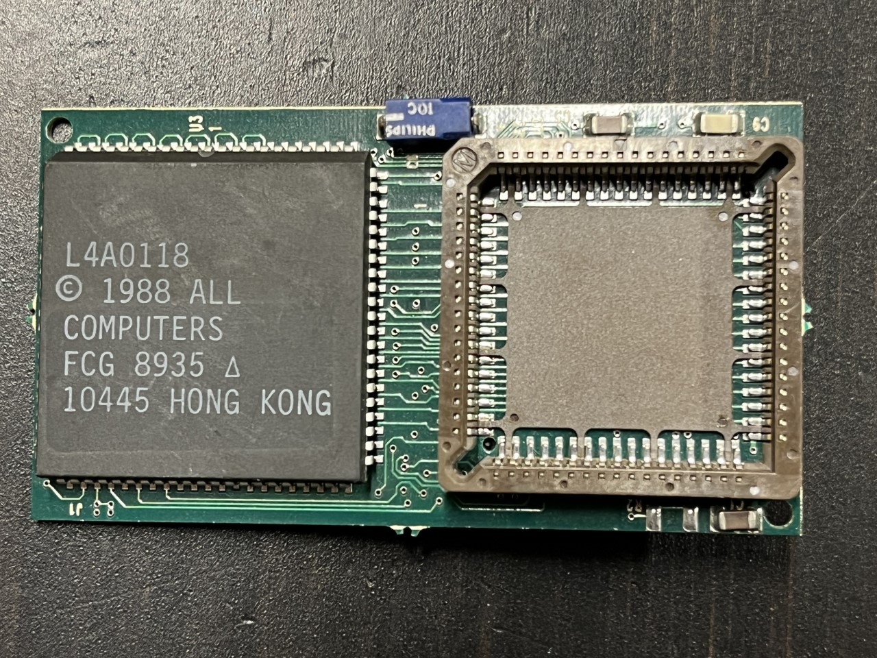 • All Computers, Inc. Charge Card II - replaces existing 286 CPU with a faster 286 - not sure where the real benefit is with this, over buying the 286 CPU directly?!?! **UPDATE** Eirik Øverby got in touch with me as he got hold of a slightly modified variant of the Charge Card II. He writes, "I have had a hard time figuring out exactly what it is; the seller insists it's basically just cache for the 286. The chips inside the socket (pic1, pic2) on the back are 4x4Kb chips, so 16Kbit each. That would give 6 KB cache, or 4 KB+tag RAM (however it's organised). The big chip on the front, however, I haven't been able to figure out. I removed the sticker on the chip, see picture - but that didn't get me any further. Your site came up, giving me a hint: The big chip *might* in fact be related to the claimed EMS support of the Charge Card II."