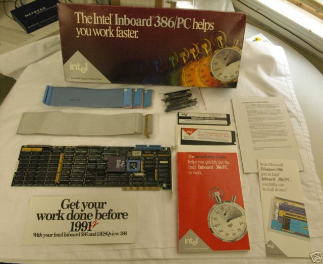 Another option arrived in 1987 with the release of the Intel Inboard/PC. This was a PC-on-a-card, sporting an Intel 80386 CPU running at 16 MHz. This expansion card would slot into an available 8-bit ISA slot on your PC's motherboard and with a ribbon cable going from the card into your motherboard's CPU socket (your old CPU removed), it would transform your venerable PC, XT, or compatible into a 386-class computer, complete with 1 MB of RAM.