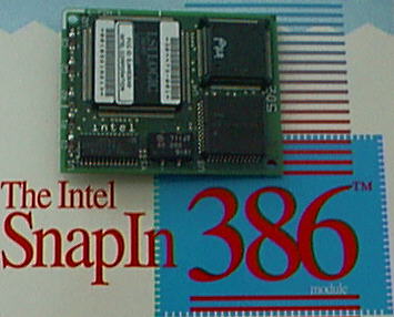 • Intel SnapIn 386 - designed for the PS/2 Model 50Z only. **UPDATE** One of my visitors, Angie Walker, provided me with some more information on the SnapIn 386. She writes "Intel apparently made at least one other version of the SnapIn 386, with a differently-shaped non-rectangular board, that was specified for Models 50 and 60, as well as the IBM AT.  Here’s a picture of it in my IBM 5170. It adds 16 KB of cache, and comes with a program to activate said cache at boot-time.  With all the cache options disabled, the machine actually runs a tiny bit slower than it did with the original 8 MHz 286.  While the machine still feels more like a 286-class machine than a true 386, the upgrade did give me access to the all-important 386 instruction set, including the ability to run all the old software that wouldn’t work with the original CPU!". Thanks Angie, I look forward to the original retail box pic!