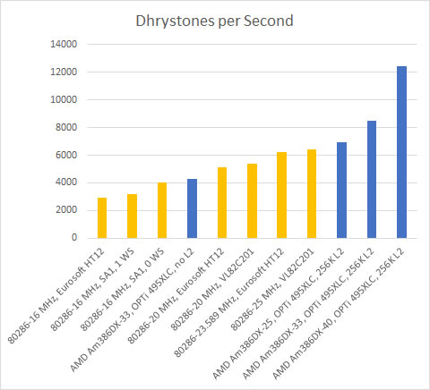 The 286s running at just 16 MHz did well against the 33 MHz 386DX with no L2 cache in raw integer performance (dhrystone formula), getting between 60% and 95% of the 386's score. When pushed to the higher clock speeds, again the VL82C201 just edged ahead of the HT12/A.