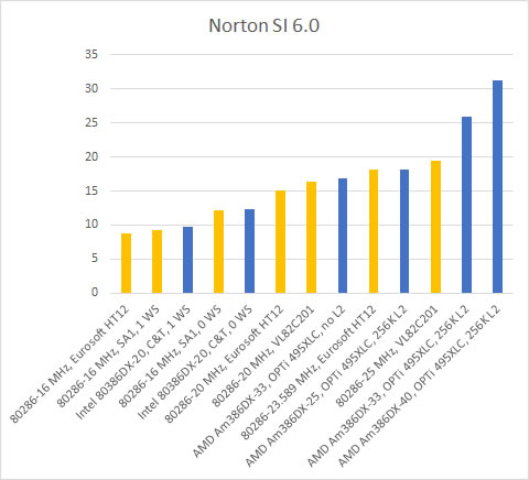 With a 40 MHz clock (crystal), meaning the 286 was running at 20 MHz, the benchmark results were: