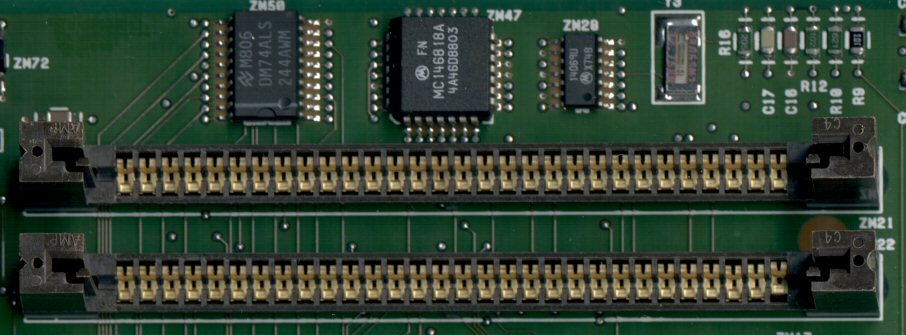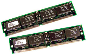 Two 72-pin SIMMs, each holding 64 MB (making up a bank that has 128 MB). These use the older FPM DRAM technology, and have parity.
