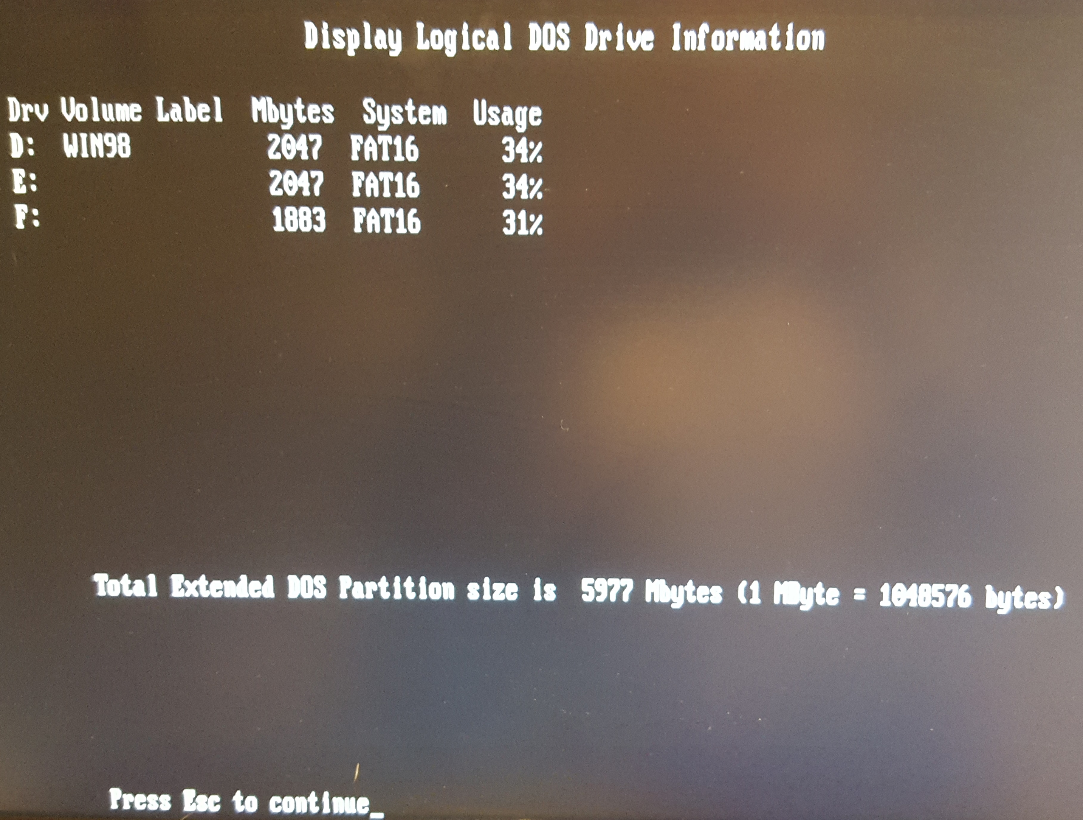 So when you install Windows, it either formats your DOS 6.22 partition to be FAT32 (overwriting it at your request), or you install to a second drive letter, e.g. D:, and it formats that as FAT32, keeping your C: drive as FAT16. Note that installing Windows 98 on a drive that has an existing operating system overwrites the MBR (Master Boot Record) on the primary partition (in my case, C:) in order to give you a 'multi-boot' capability with Windows 98 as the default option, but also that 'Boot Previous Operating System' choice as well.