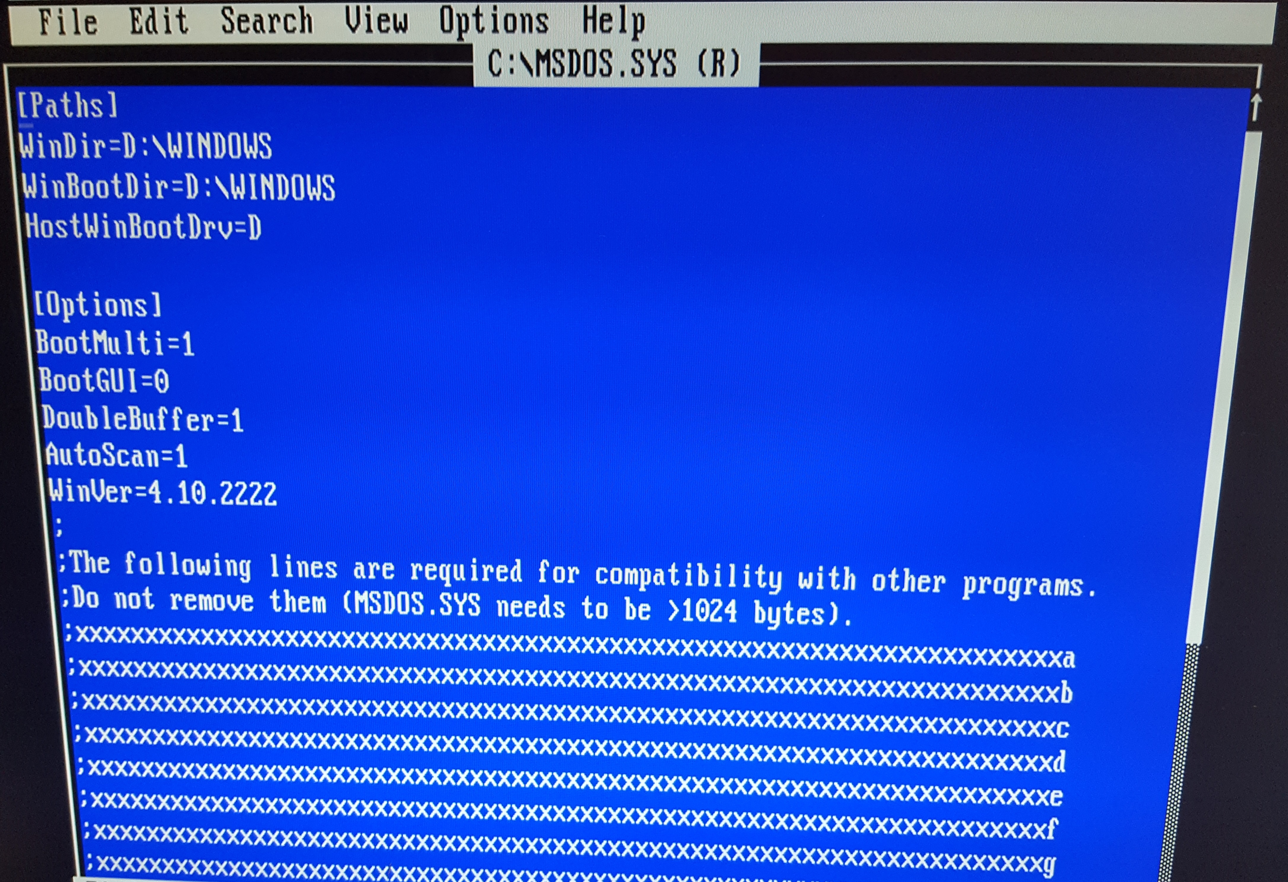 I then run edit c:\msdos.sys, and set "BootGUI" to 0 to ensure Windows will not start automatically. I also add the line "Logo=0" in the [Options] section, as I don't want the Windows 98 logo to appear when I boot the computer.