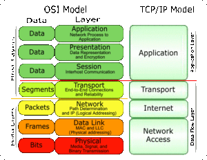 Starting from the bottom which is the Physical layer... this is basically the copper wire in your network cable connected to your network card - this takes the data being sent and passes it up to the Data Link layer. It is here that the data is grouped into 'frames' for easier transport in chunks (that's my term, sorry). From here the data is passed up to the Network layer. It's here that the "IP" part of TCP/IP kicks in to form a 'packet' consisting of multiple 'frames' of data, and to determine where the packet's destination is. It then passes the newly formed packet with more information held within it up to the Transport layer which is where the "TCP" part kicks in. It is here that the ordering of packets received at the destination and any error checking is done to ensure the data packets arrive 100% the same as what was sent and in the correct order. The rest of the layers (Session, Presentation and Application) are the receiving Application's responsibility to do with the data as it chooses. TCP/IP merged a number of the OSI model's layers together for simplicity, as you can see on the right side of the illustration above.
