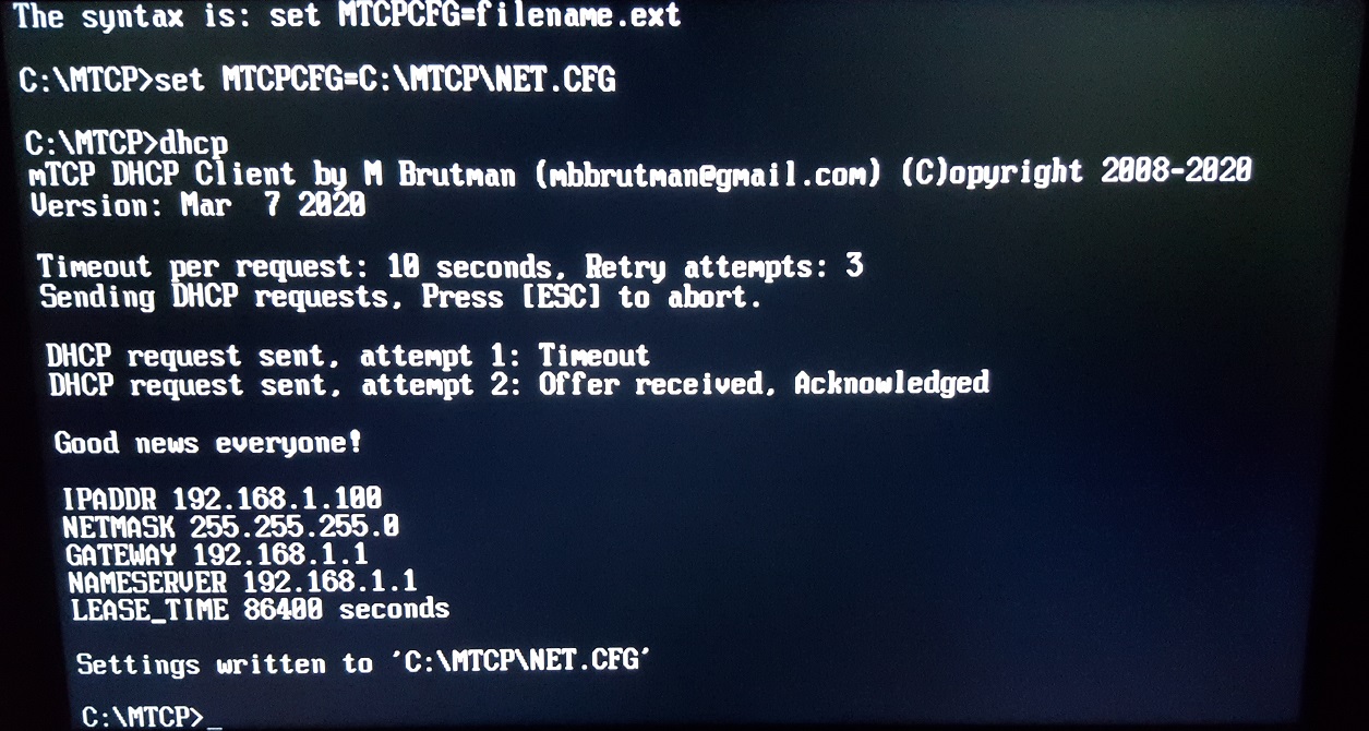Now the packet driver is running, it's time to get the machine assigned an IP address. To do this we run mTCP's DHCP utility. DHCP stands for Dynamic Host Configuration Protocol, and basically allows networking software to choose an available IP address for your machine automatically (as opposed to defining a fixed IP address that will never change). I had some issues getting the DHCP utility to work initially, where it would simply timeout after 3 attempts. It would also complain that there was a lot of whitespace on line 23 of the config file. To resolve this, I edited the .CFG file and ensured there was no whitespace after the # comment. I also made sure there was no comment (#) at the start of the following lines and edited them to match up with my directory structure where I had installed mTCP: