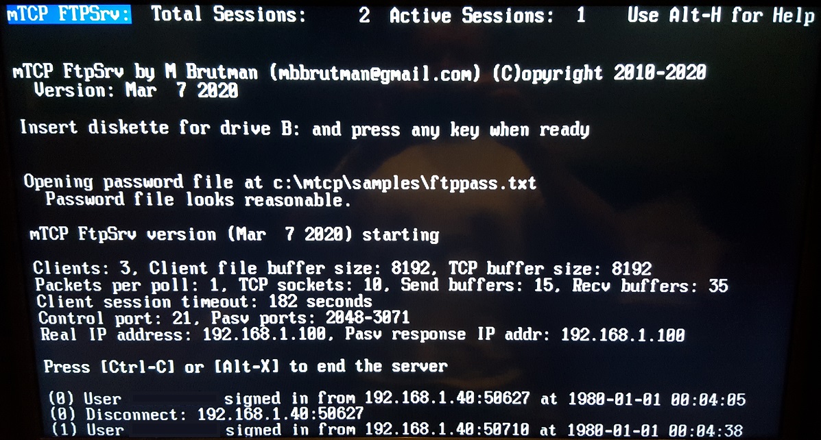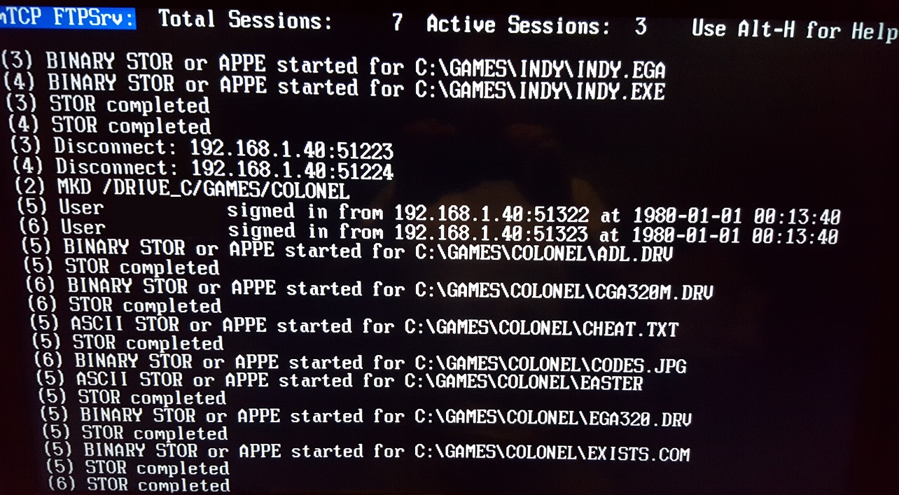 Now to test the network connection by transferring some files from my Windows 10 PC to the XT. I used FileZilla on the Windows 10 side, and on the XT computer I ran mTCP's FTPSRV utility: