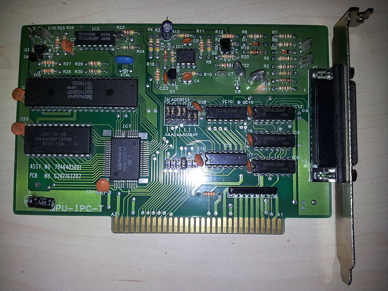 To connect the MT-32 to a PC required what Roland called an "MPU-401" (Midi Processing Unit-401), plus a suitable interface card installed in one of the PC's expansion slots. Roland made MPU interface cards and plug-in adapters for all the popular computers at the time, including the Apple II (MIF-APL), Commodore 64 (MIF-C64), IBM PC (MIF-IPC), MSX (MIF-MSX), and NEC PC-98 (MIF-PC8). So the connection from your MT-32 to the computer looked something like this: