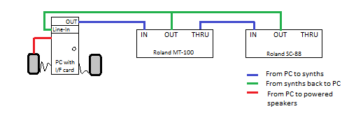 2) The outputs from both synths are then sent back to the PC sound card's "Line In", where the software mixer for the sound card merges all sounds together (including digital sound effects from the sound card itself). The problem with the above approach is that the MT-100 must be switched on for the MIDI messages to get out of the MIDI THRU and into the SC-88. This is fine though - you just need to press ALL + MUTE on the SC-88 when you want to let the MT-32 play.