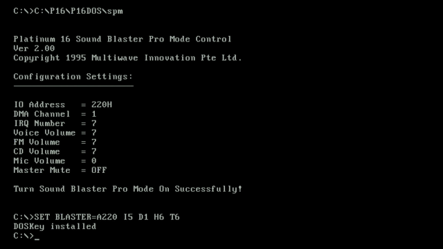 Once the PC is rebooted into DOS, the 'SPM' (Sound Blaster Pro Mode Control utility) initialises the card: