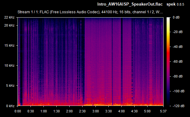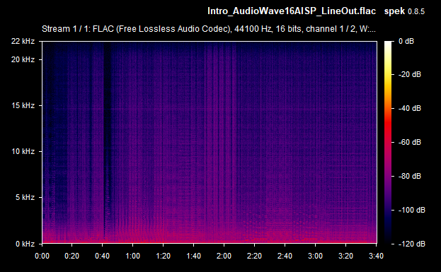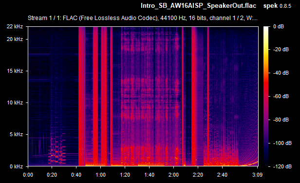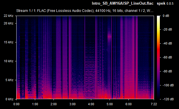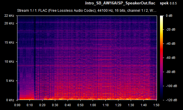 On average then, the card's weighted line-out SnR was a very respectable -67.4 dB, and the speaker-out SnR was also -67.4 dB. Some of the line-out SnRs seems to be calculated wrong (they would never typically be lower than the speaker-out SnR, as the onboard amplifier that drives the higher signal for speaker-out introduces more noise in the output) - I'll chalk this up to the slight differences between the two audio recordings (line-out recording vs speaker-out recording). The spectrograms tell you the real story, and using the line-out was, as expected, a noticeably lower volume since it's unamplified. Going forward, I will capture the same measurements with other sound cards for easier comparison.