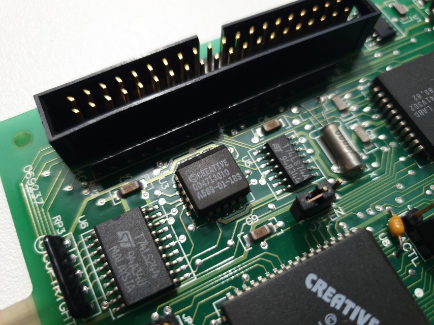 Because the YMF262 did not have an integrated CD-ROM controller inside the chip, the Sound Blaster Pro cards have a separate controller IC on the card in the form of the Creative chip marked 004713010 that lives right next to the 40-pin header.