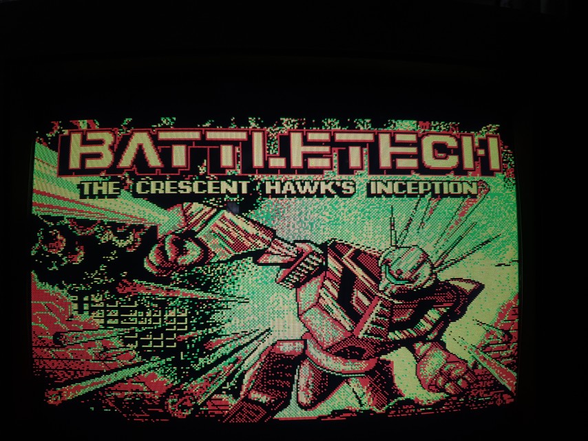 The DOS version of the tabletop war game was written by Westwood Studios and published by Infocom in 1988. CGA was its lowest graphical mode, also offering EGA and MCGA/VGA. The CGA option ran in Mode 04h (320 x 200 in 4 colours), using palette 0 with the four colours of black (#000000), green (#55ff55), light-red (#ff5555), and yellow (#555555).