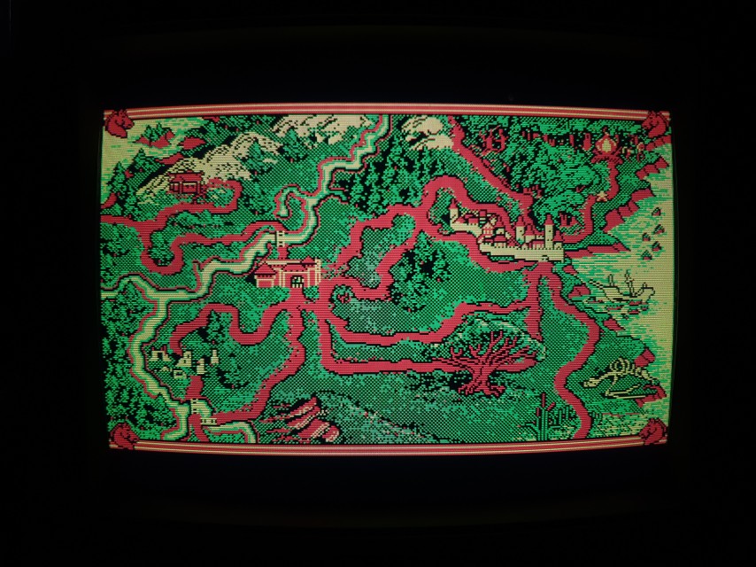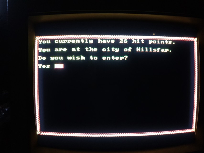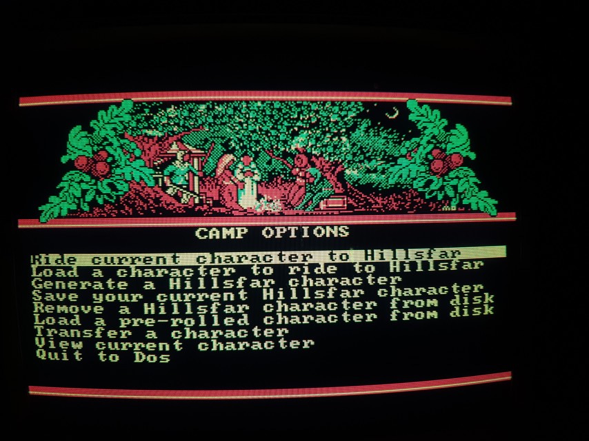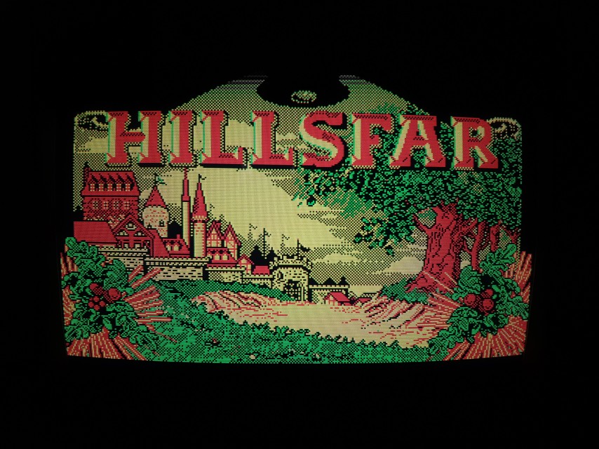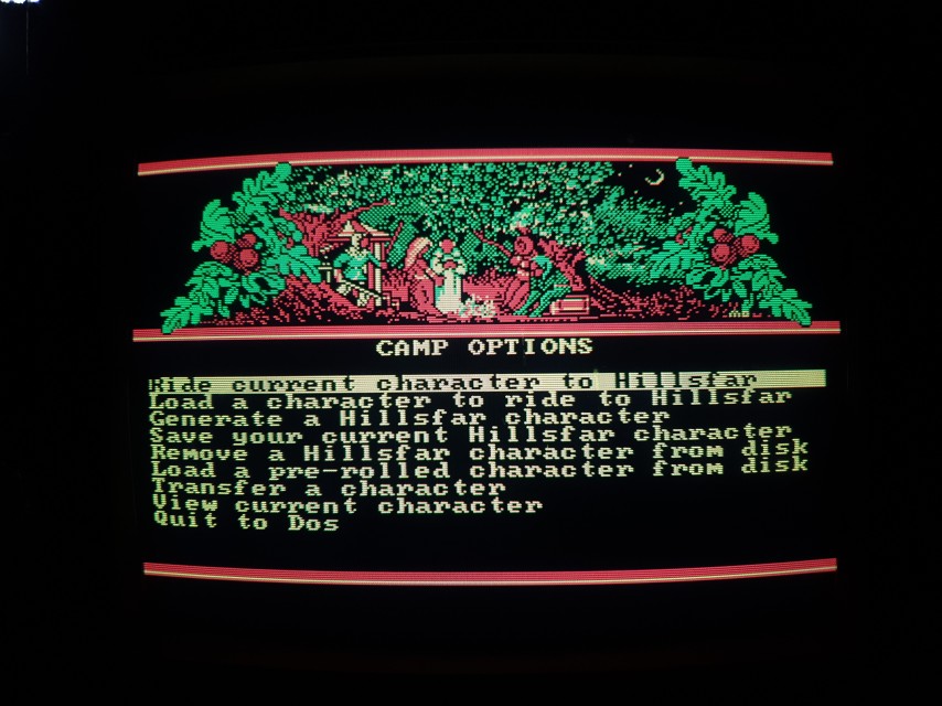 One of the first role-playing games for DOS, Hillsfar was written by Westwood Associates and published by Strategic Simulations, Inc. in 1989. Graphics options were CGA or EGA. The CGA option ran in Mode 04h (320 x 200 in 4 colours), using palette 0 with the four colours of black (#000000), green (#55ff55), light-red (#ff5555), and yellow (#555555).